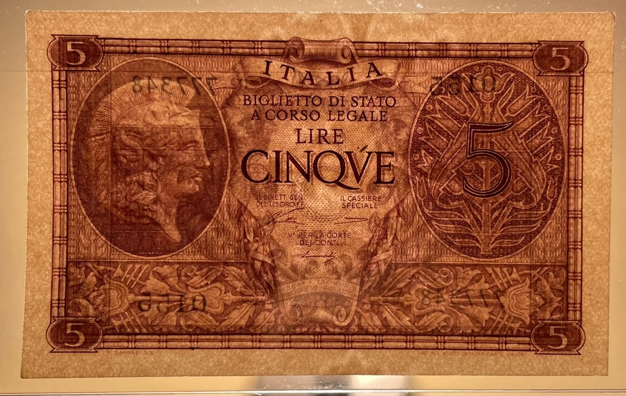 Il biglietto di stato da 5 lire “Atena Elmata” venne realizzato grazie al decreto d’emissione del 23 Novembre 1944 ma andò in circolazione a partire dal luglio 1946.