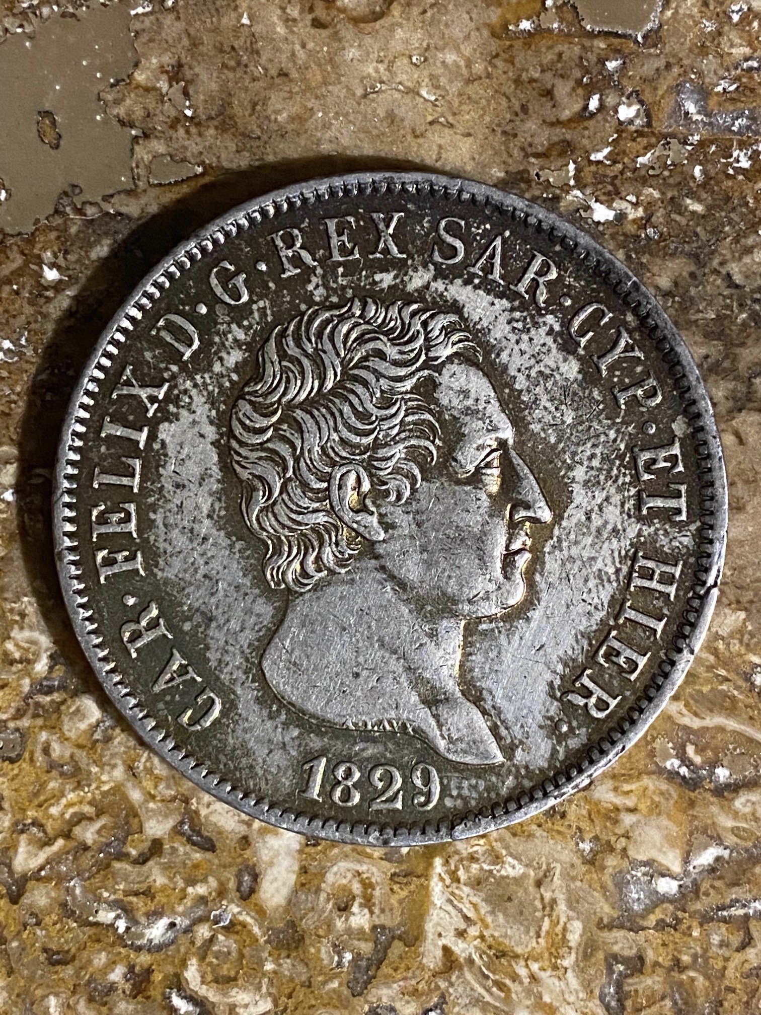 continuando nella carrellata fotografica di alcuni esemplari in collezione oggi Vi sottopongo un anonimo 5 lire 1829 Genova, comune e neanche chissà che come conservazione, ma caratterizzato da una patina particolare soprattutto al D. Questa moneta si è patinata più da un lato che dall’altro dopo lustri e lustri passati sul velluto blu.