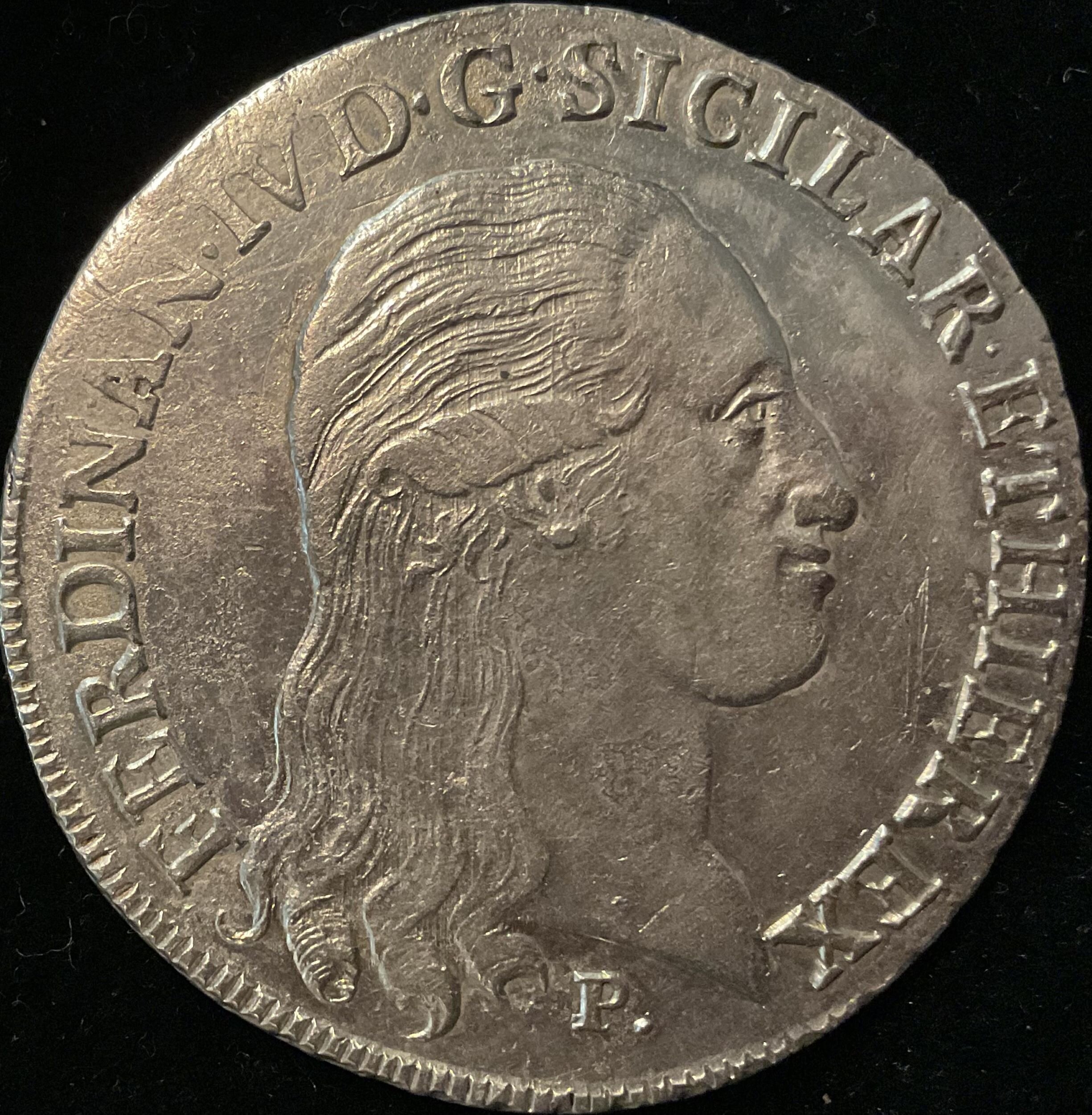 l’avevo già condivisa ma stasera la ripropongo augurandomi di aver migliorato la qualità delle foto di questa vecchia signora con l’errore famoso nella legenda al D, in grande spolvero, secondo un amico numismatico appassionato di Re Ferdinando, seppure con graffi e qualche debolezza di conio, uno dei migliori esemplari esistenti, con lustro di origine assolutamente intatto.