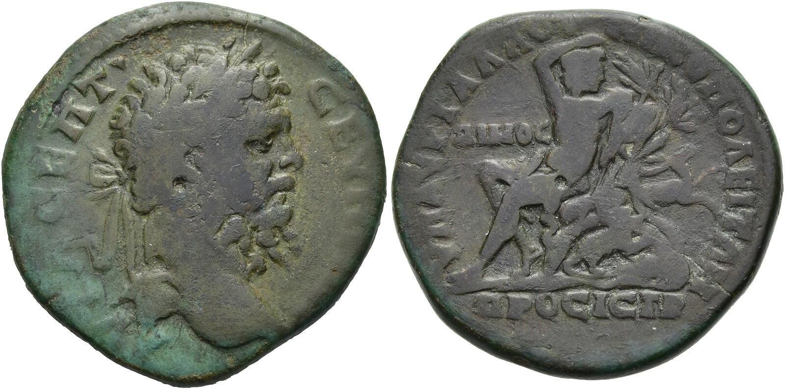 Bronzo di Settimio Severo (Markianopolis, Mesia) con Pollienus Auspex Minor titolare dello Stato, che raffigura al dritto il busto dell’imperatore laureato, drappeggiato e corazzato a destra, e al rovescio Tyche con kalathos, remo e cornucopia (Gorny & Mosch, Online Auction 286, 29 Mar 2022).