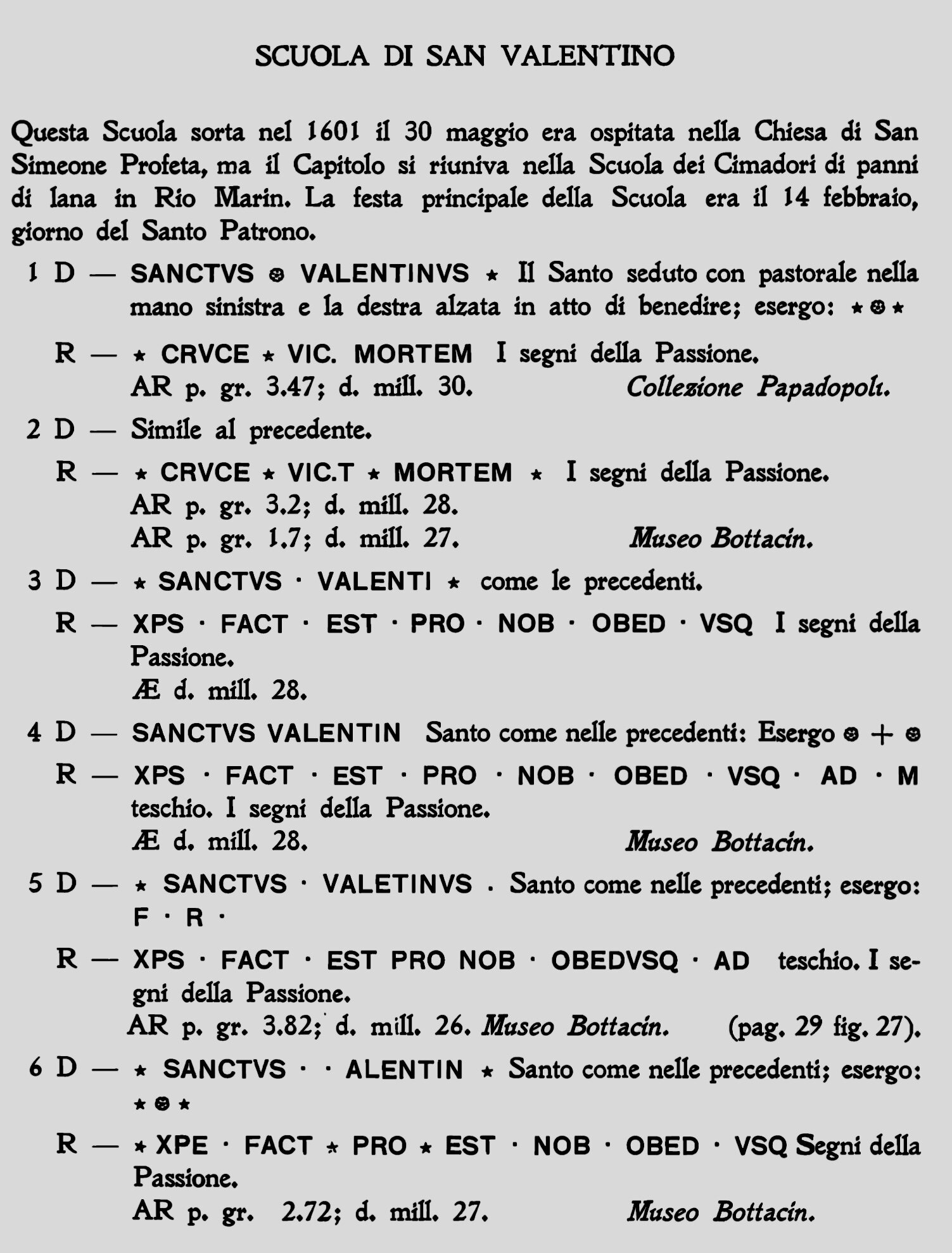 Sorta il 30 Maggio 1601, la Scuola di San Valentino era ospitata nella chiesa di S.Simeone Profeta, comunemente detta S. Simeon Grando. Nella chiesa è ancora visibile, in una piccola nicchia ricavata lungo la parete della navata destra, un’antica statua di S. Valentino. Il Capitolo della Confraternita si riuniva però nella vicina sede della Scuola dei Cimadori di lana, che si trovava in un fondamenta Rio Marin. Festa principale della Scuola era il 14 Febbraio, giorno del Santo Patrono. Dal momento che possedeva “pile e torselli” con l’impronta della Passione, di S. Valentino o di Sant’Antonio, la Zecca poteva far facilmente fronte alle richieste delle varie Scuole, associando, ad esempio, a una faccia della tessera relativa al Santo titolare, un rovescio per così dire “universale” come quello legato a motti e simbologie della Passione.