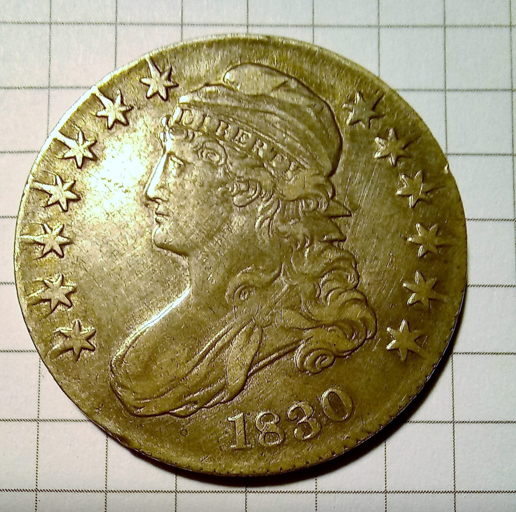 Passata la delusione, sono passato alla catalogazione delle due monete per l'inserimento "organico" nella mia collezione. Per far ciò ho utilizzato una edizione 2013 del "The official red book" che, da quanto ho capito, deve essere una  specie di "Bibbia" del collezionista di monete statunitensi (acquistata a suo tempo per cercar di fare germogliare la passione numismatica nei miei figli). Per quanto riguarda il mezzo dollaro Capped Bust, dalla consultazione del catalogo ho constatato che esistono tre versioni della moneta: quella con lo zero piccolo nella data 1830, un'altra con lo zero grande (senza differenze apprezzabili nella quotazione) e la terza, con quotazioni di tutto rispetto per una moneta nel suo complesso comune, definita come "large letters".