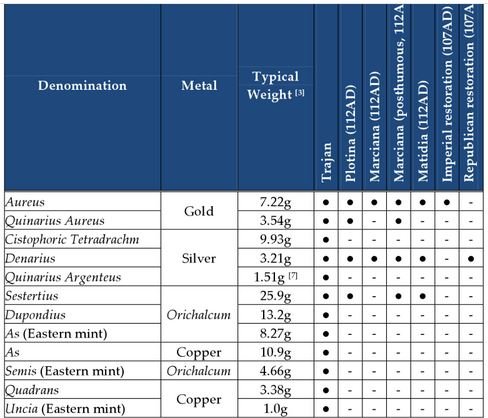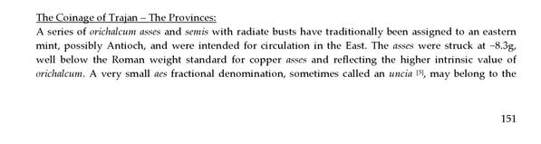Si tratta di una serie di emissioni in oricalco che RIC classifica come assi e semissi coniati appunto negli ultimi anni del regno di Traiano: