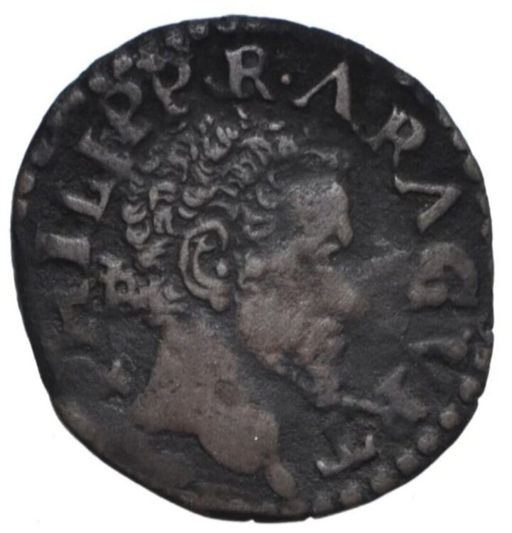 Nella monetazione di Filippo II è molto comune riscontrare questa particolarità.