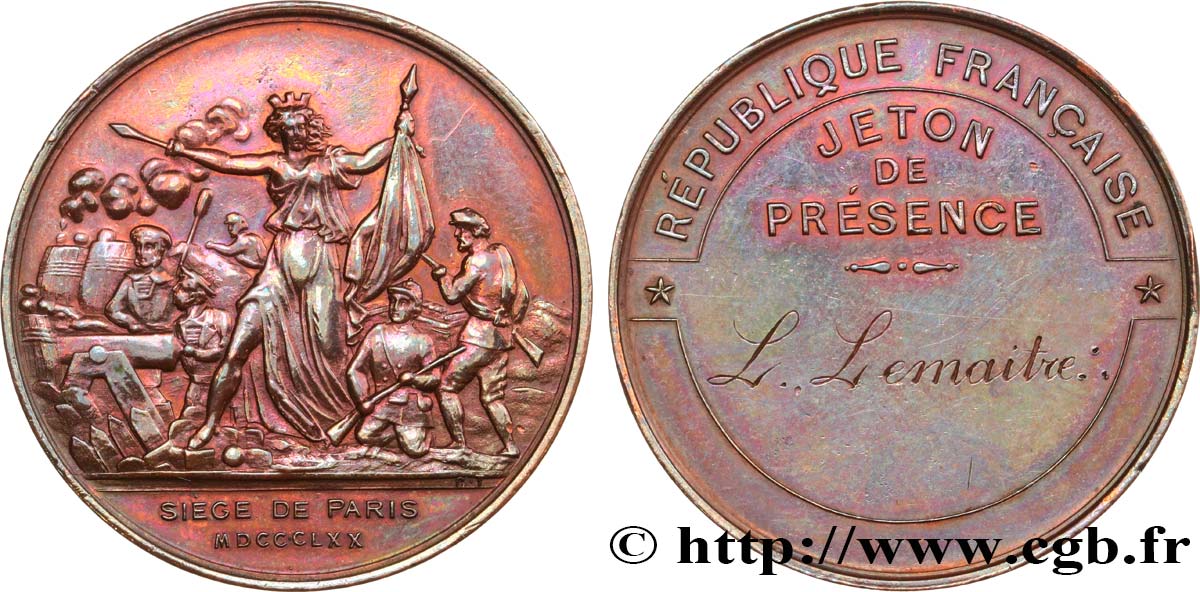 Sembra che la medaglia commemorativa dell’assedio di Parigi sia stata fatta coniare da uno speculatore che le ha dato il nome di JETON DE PRESENCE. L’idea ha avuto un grande successo per le numerose richieste del gettone in bronzo o in argento che doveva portare il nome del suo possessore.