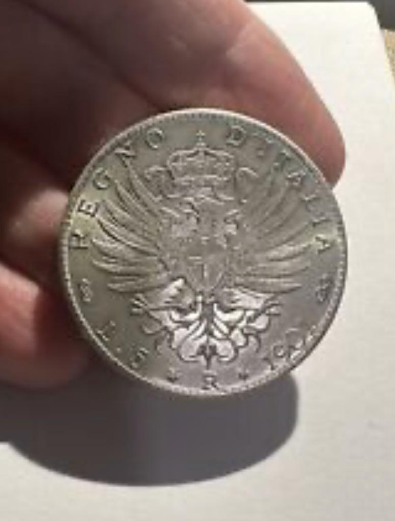 Allora gli può scrivere che con una foto del genere non si capisce nulla. servono foto migliori fronte retro e bordo incluso peso e misure...oppure che si rechi da un perito numismatico ( già che vive a londra ce ne sarà uno esperto in lire del regno ) e chieda a lui che controlli la moneta in mano....semplice.