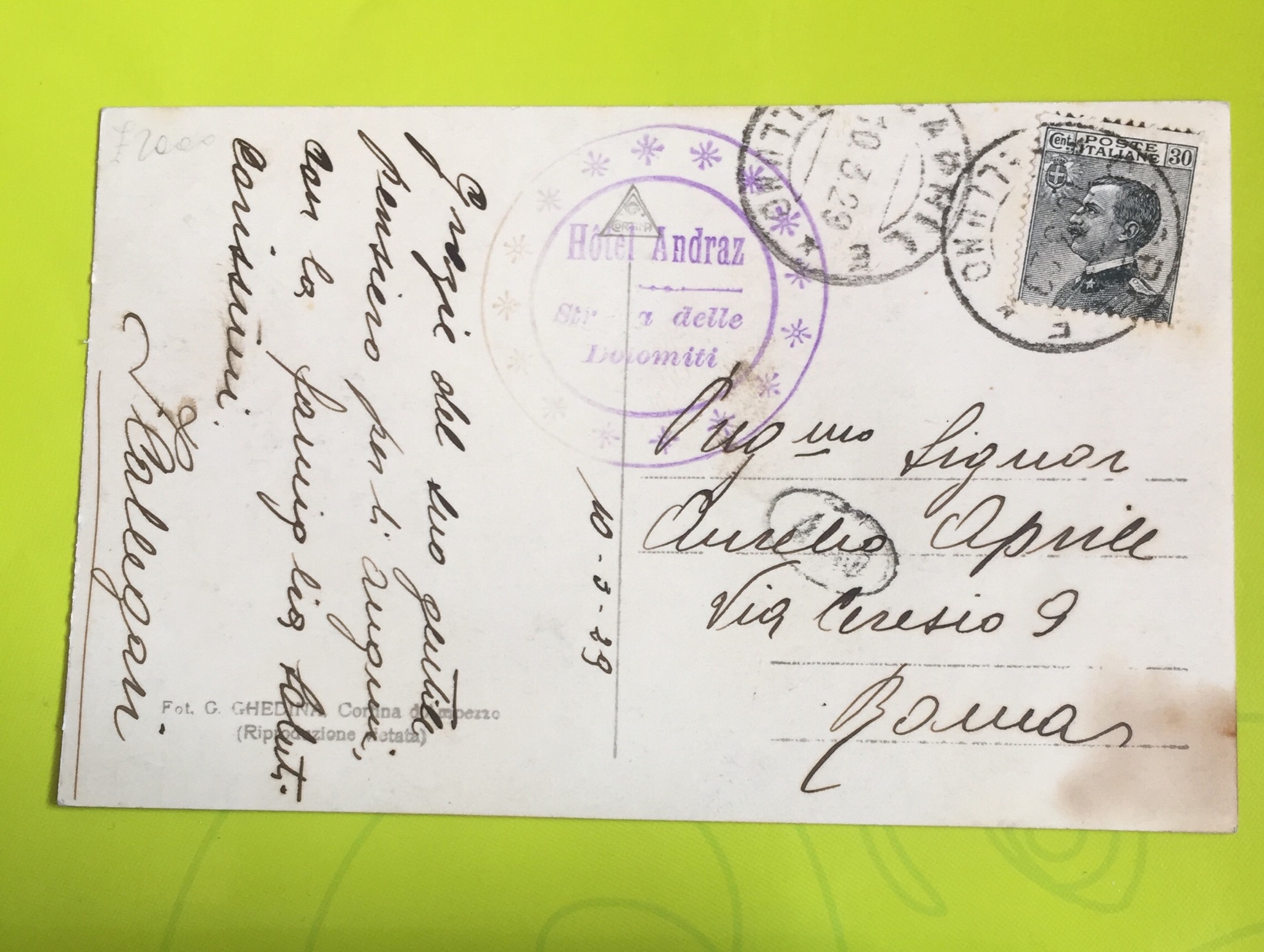 PostOffice Inviato 14 Giugno, 2023 Autore #199 Inviato 14 Giugno, 2023 (modificato) Cartolina illustrata con timbro blu di acquisizione dell'Hotel Andraz, ..l'hotel instrada (consegna) per la partenza la cartolina all'ufficio di Agordo (Belluno) credo..??! (L'annullo non è nitido) , che dista 30km circa dalla località di Andraz il 10.3.1929. In perfetta tariffa per l'interno con 30c. grigio nero Michetti volto a sx dell'emissione del 1925. Dal web qualche informazione sull'hotel Andraz.: https://ricerca.gelocal.it/corrierealpi/archivio/corrierealpi/2017/07/18/belluno-quel-piccolo-ospedale-nell-ex-hotel-andraz-55.html Modificato 14 Giugno, 2023 da PostOffice 1