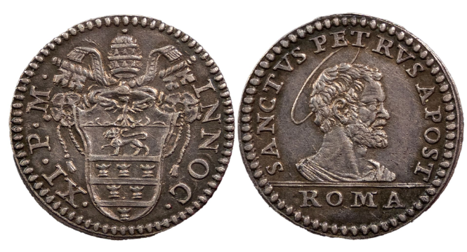 Salve, desideravo avere la conferma della mia classificazione, nonchè un parere generale su questo argento di Innocenzo XI. Pesa 1,39 g. Al D, testa di S.Pietro aureolata a dx, SANCTUS PETRUS APOST, e in esergo: ROMA. Al rovescio, il nome del pontefice attorno allo stemma, ecc.
