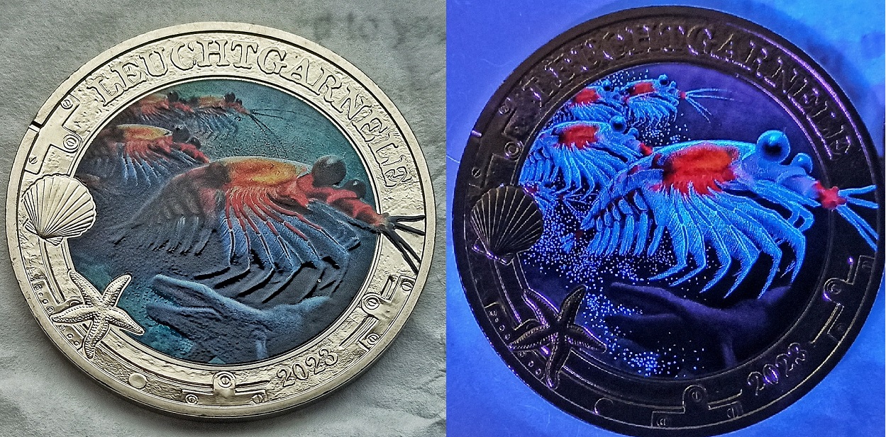 Con questi bellissimi soggetti in natura realmente luminosi e l'effetto fluorescenza sotto la torcia UV, differente dalle monete delle serie precedenti, con più colori in evidenza, già la preferisco.