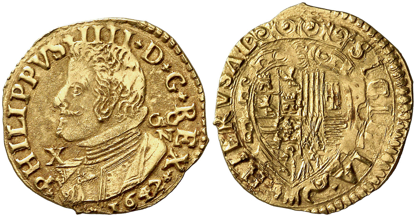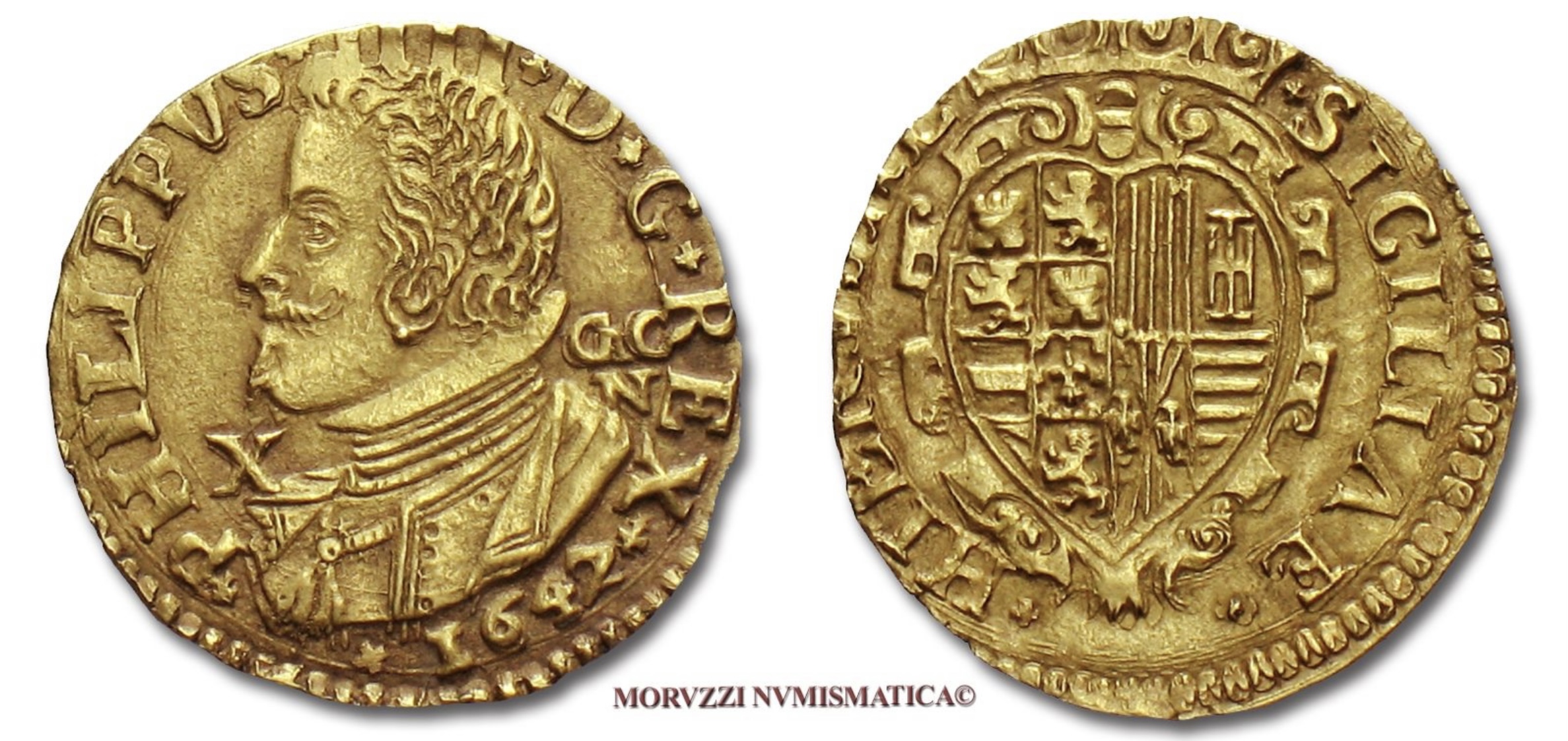 Regno di Napoli, FILIPPO IV, 1621-1665, SCUDO, Emissione: 1647, D/ busto a s., R/ stemma a cuore coronato, Zecca di Napoli, Rif. bibl. Pannuti-Riccio, 12; Metallo: AU / ORO, gr. 3,41, (MZ127553), Diam.: mm. 19,81, mSPL, (RR)
