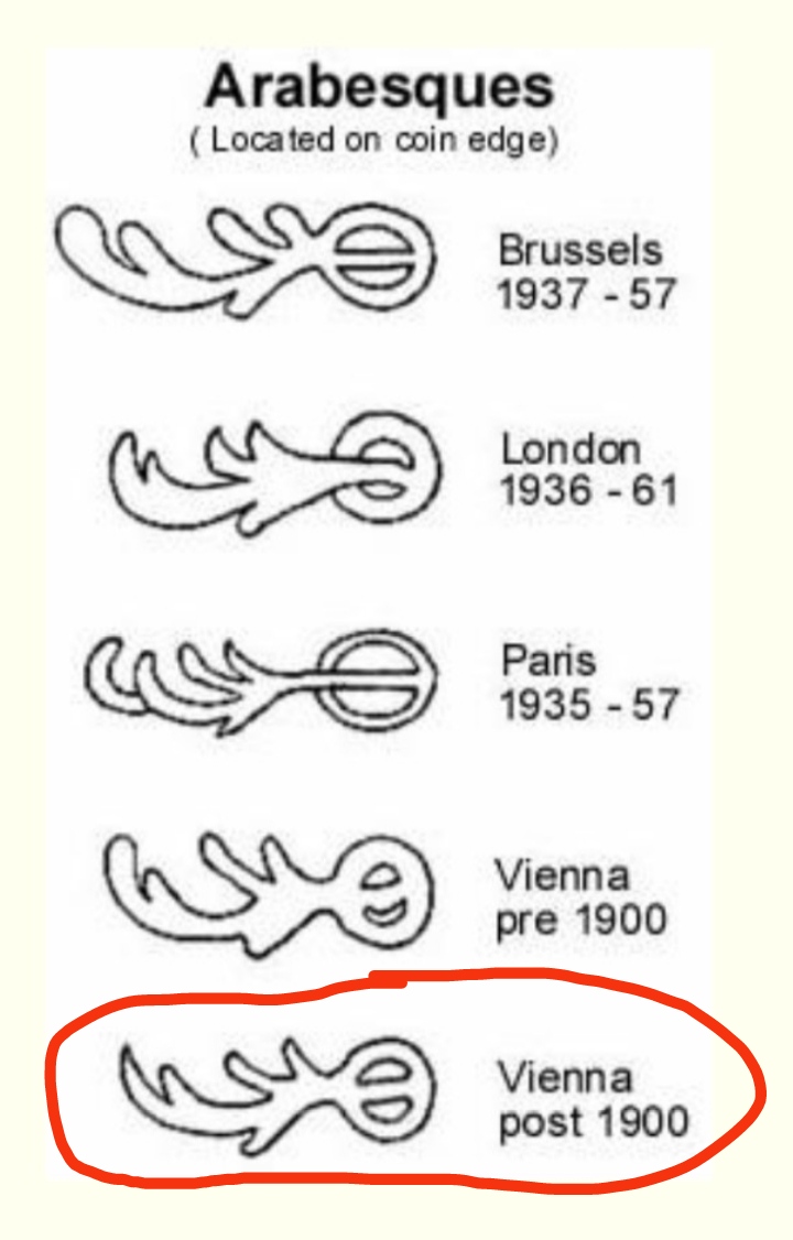 Ho notato solo di recente che l' arabesco della mia moneta della zecca di Vienna segue effettivamente due linee distinte, esattamente come indicato nel disegno cerchiato in rosso.