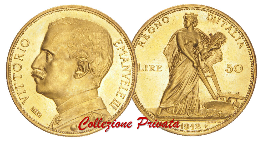 50 LIRE - Anno 1912 - Aratrice - D/Busto del re a s. R/Personificazione dell’Italia con aratro e spighe - Au - P.653 RARA qFDC