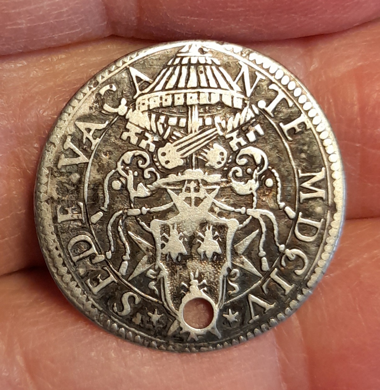 vorrei chiedere aiuto ai più esperti sulla rarità di questo giulio di Sede Vacante, purtroppo malridotto e con un vistoso foro.