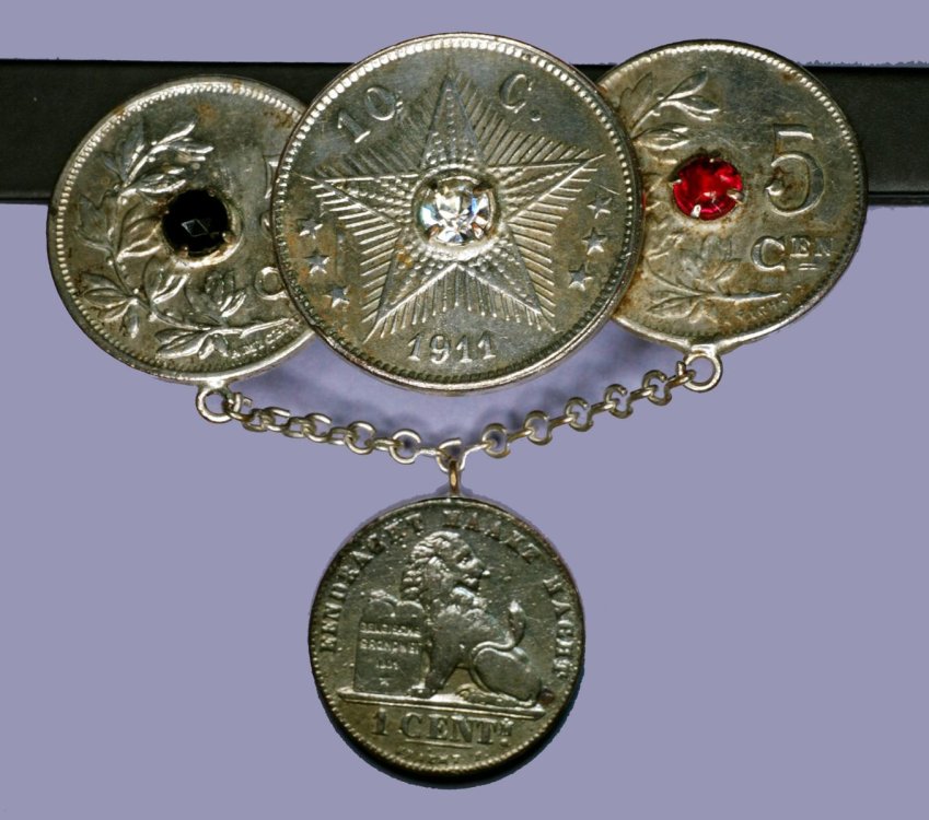 Iniziamo con quello che è palese: è una spilla, con in alto al centro un 10 centesimi 1911, Congo belga, Re Alberto I; ai lati due 5 Centesimi belgi 1906+1913 (Leopoldo II + Alberto I)