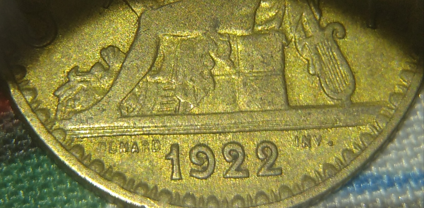 Due esemplari della moneta da 1 Franco del 1922 con entrambe le cifre 2 aperte