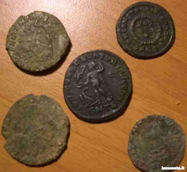 Quella in alto a destra è un bronzetto del tipo VOT/XX, forse attribuibile a Costantino II, mentre le restanti sono tutte FEL TEMP REPARATIO. Quelle a sinistra, credo, rispettivamente riferibili a Costanzo II (zecca di Costantinopoli) e Costanzo Gallo, presentano entrambe al rovescio un cavaliere disarcionato trafitto da un soldato, mentre sul rovescio di quella in basso a destra è osservabile una fenice posta su di una pira.