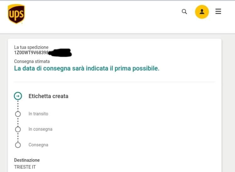 Il 5 giugno mi si notifica spedizione e mi si fornisce codice per il monitoraggio della spedizione (corriere UPS)