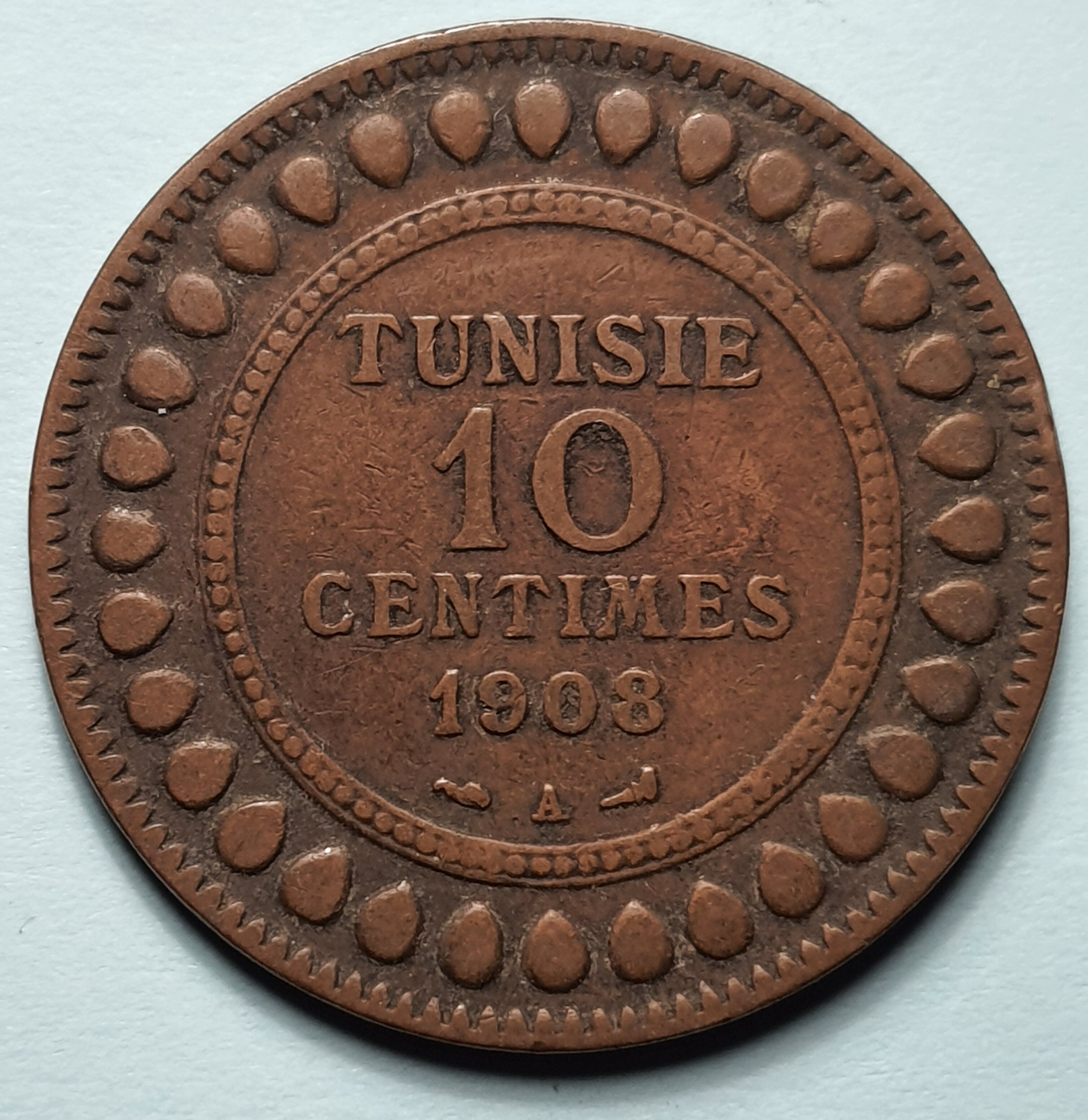 ho trovato questa bella moneta del 1908 dalla Tunisia (al tempo protettorato francese). L'esemplare pesa 9,57 g (9,77 teorici), diametro di 30,5 mm - in bronzo e coniata a Parigi in 500.000 esemplari.