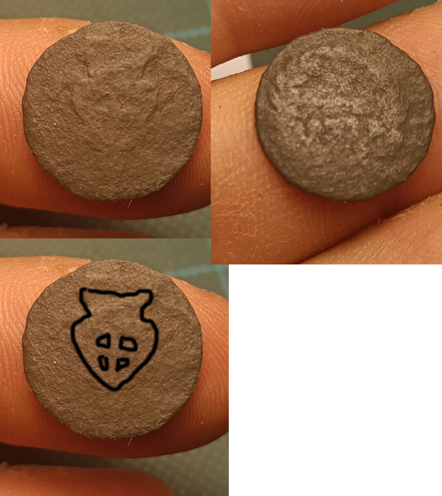 A destra vedo un motivo "VOT", sempre se la moneta possa essere romana (peso e diametro ci stanno), a sinistra un demone, ma questa potrebbe essere pareidolia o una deviazione personale! ;)