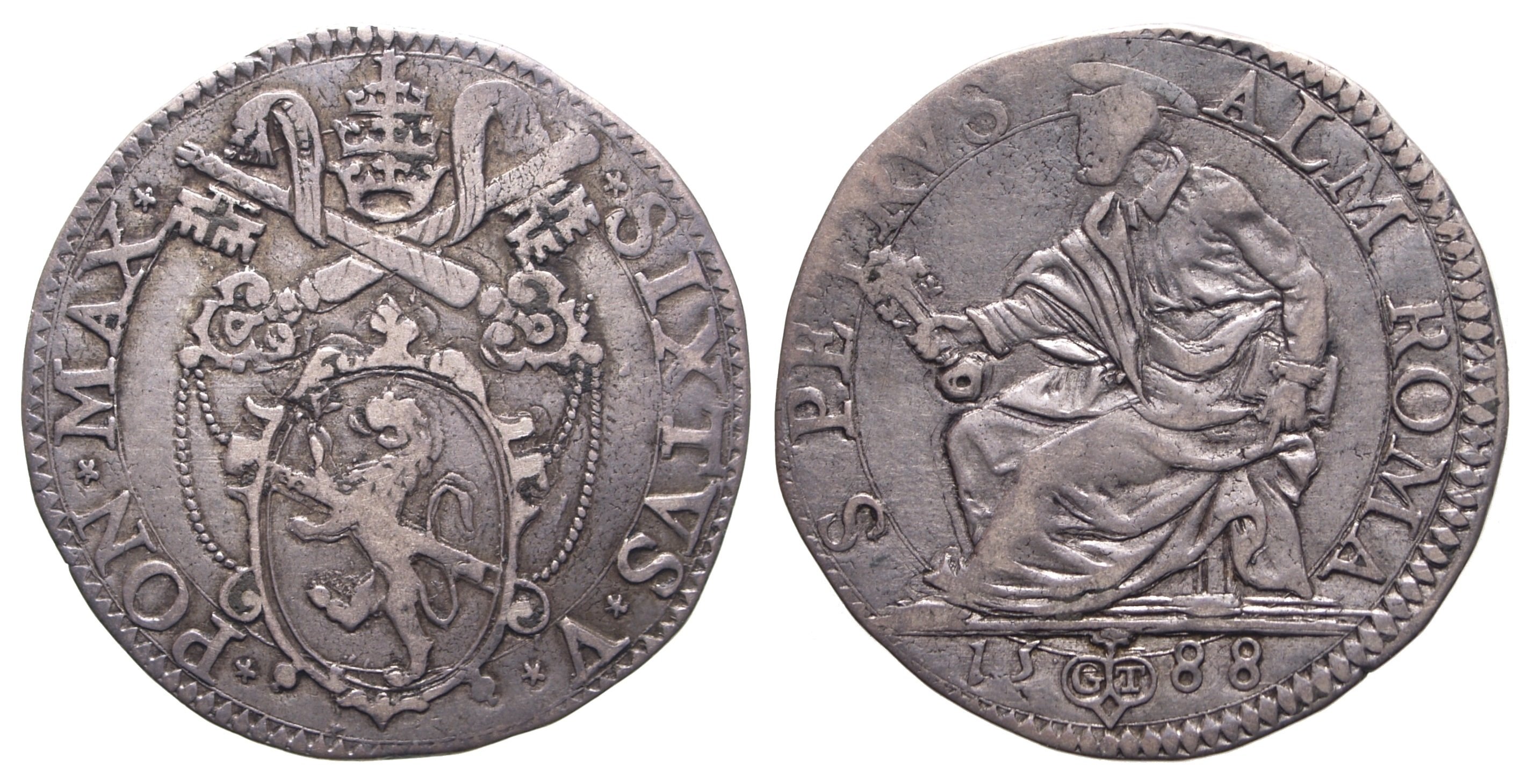 R/ il Santo, nimbato, seduto, volto a sinistra, tiene nella destra protesa le chiavi oblique ed inverse e nella sinistra il libro contro il fianco. * S * PETRVS * _ * ALM * ROMA * All'esergo: * 15 - 88 * ai lati del segno di zecca di Girolamo Tronci, zecchiere.
