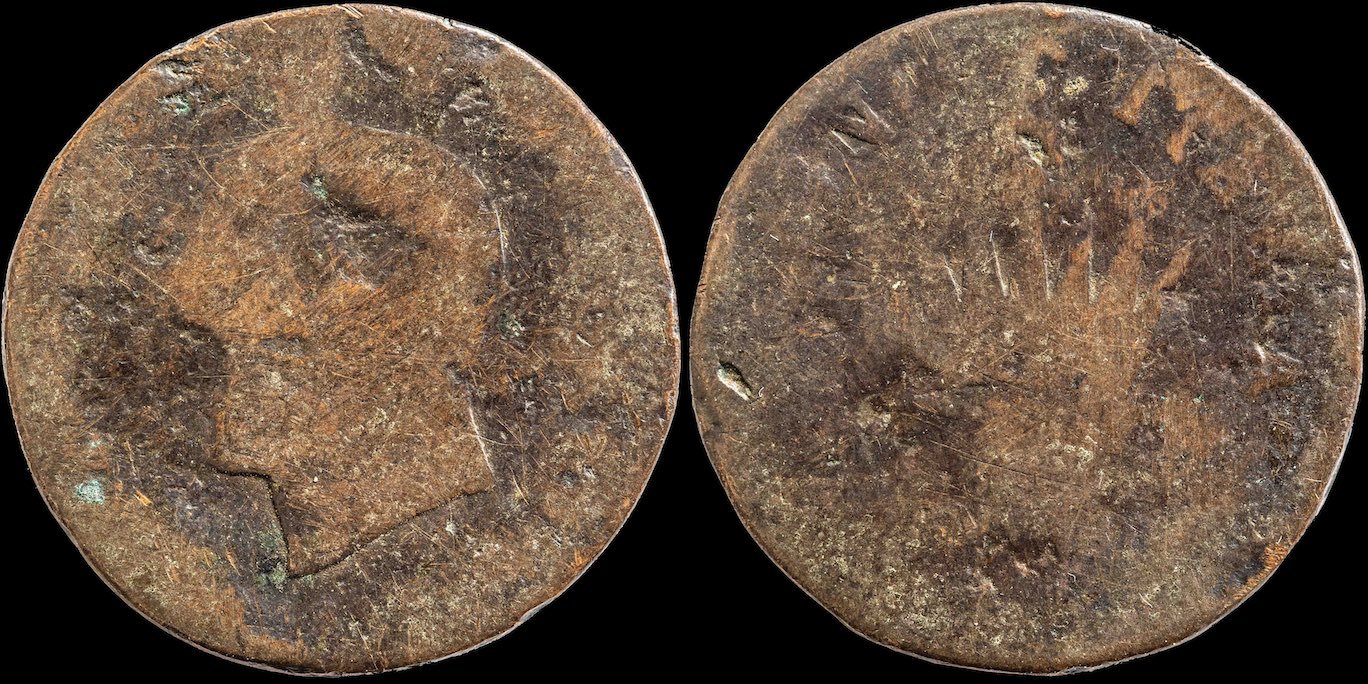 In questi giorni ho avuto tra le mani questa vissutissima moneta che sono riuscito ad identificare come 3 centesimi di Napoleone I.