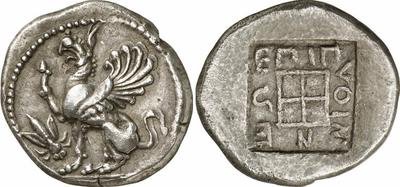 Tetradrachm (Silver, 14.47 g 5), c. 450. Griffin seated to left, right foreleg raised; to left, bee moving downwards, seen from above. Rev. around linear quadripartite square; all within incuse square. May 151 var. (same reverse die but bee seen in profile). Extremely rare, perhaps unique, the only known example from this obverse die. Nicely toned and struck in high relief. Extremely fine.