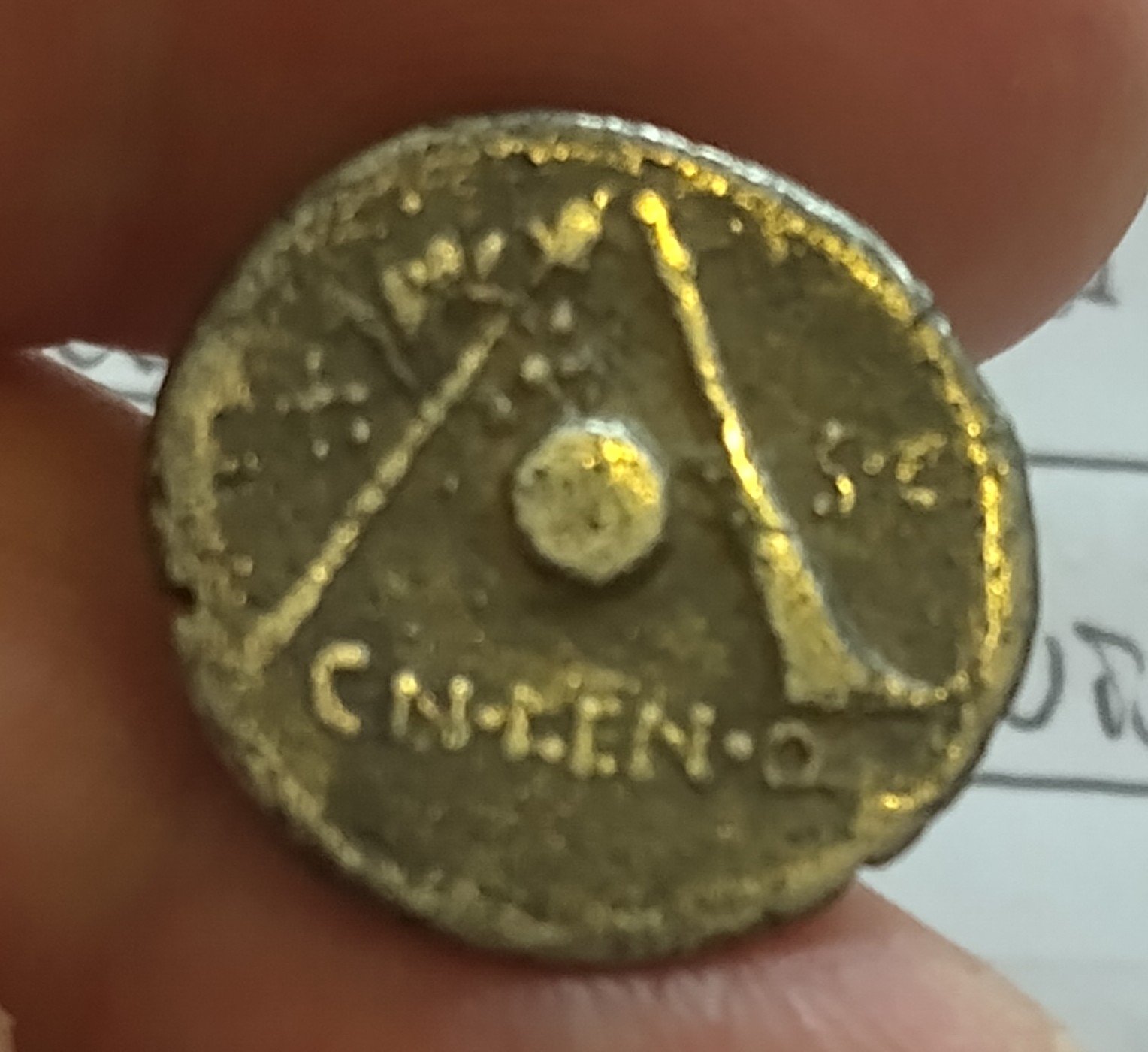 Un denario della Gens Cornelia con al dritto il Genio del popolo romano con uno scettro sulla spalla e G.P.R., mentre al rovescio un globo tra uno scettro, una corona d'alloro ed un timone con scritto Ex S-C e in esergo CN LEN O.