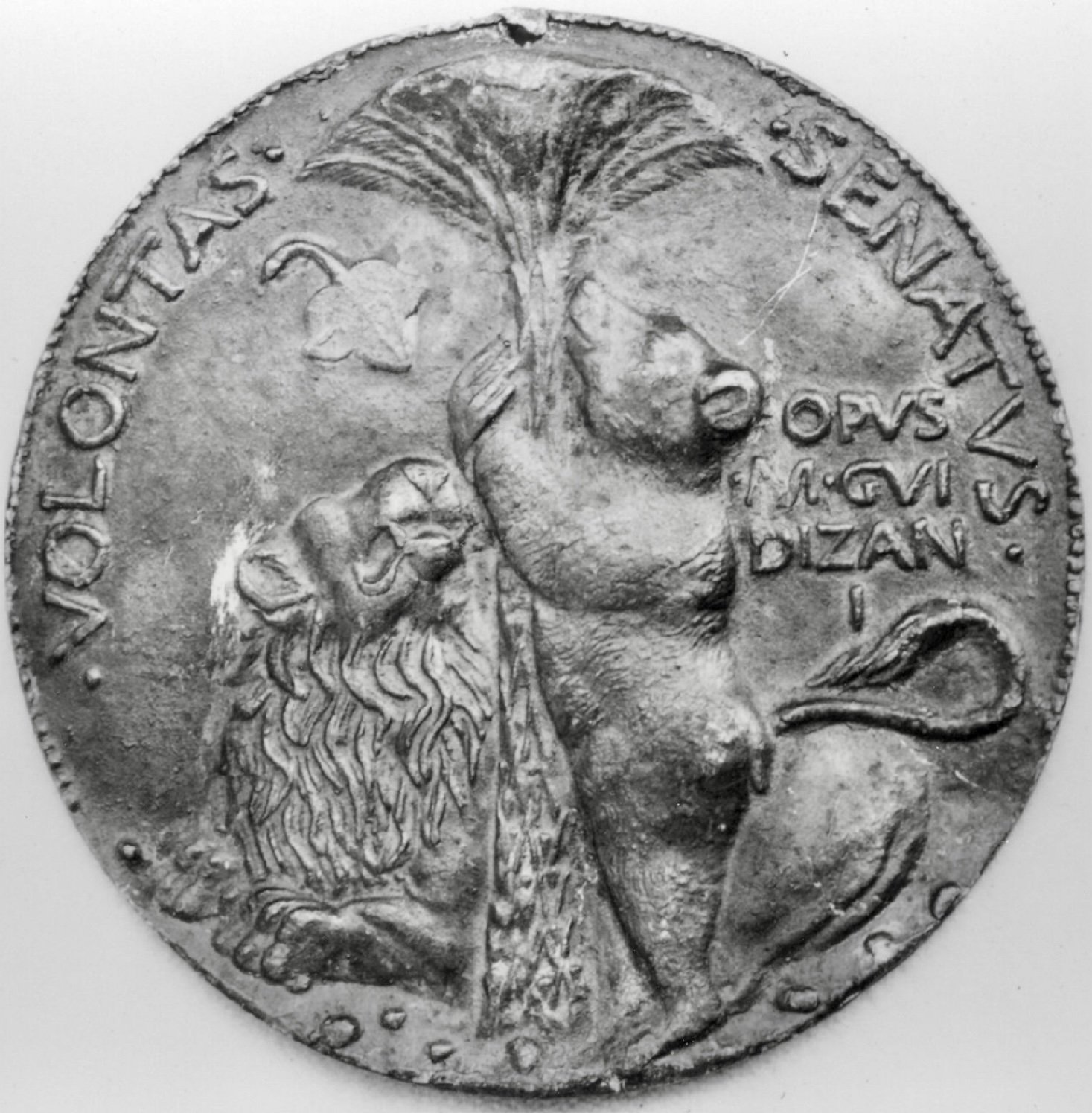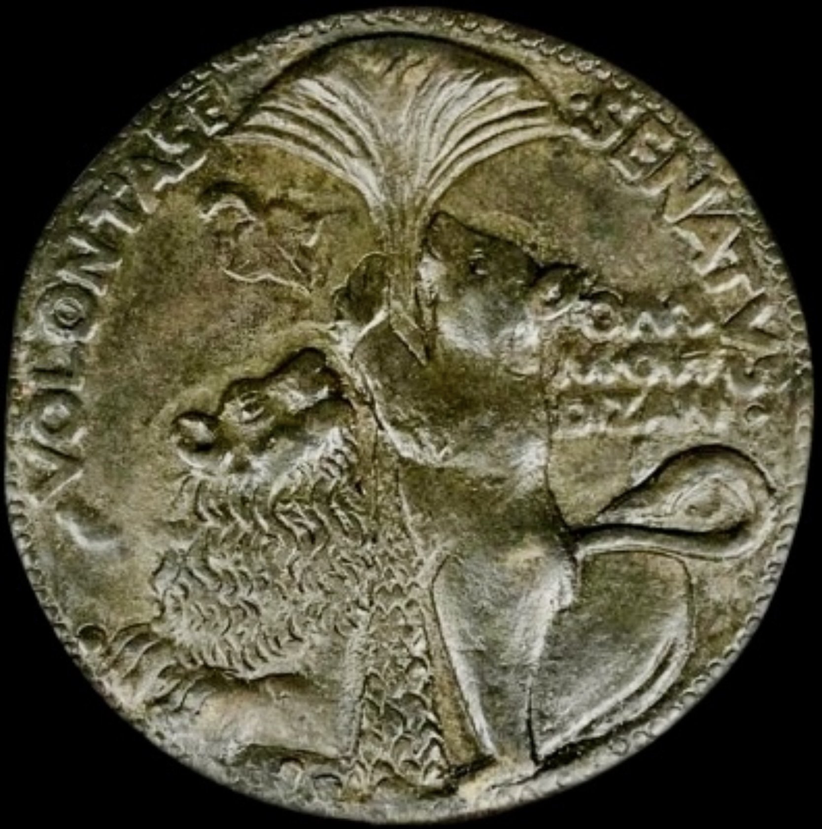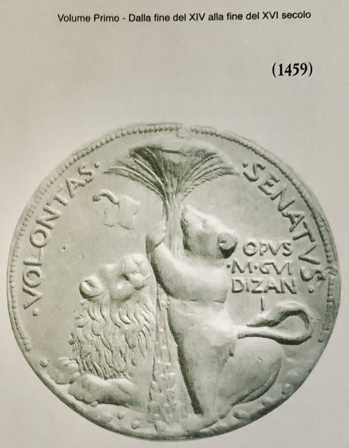 ITALY, Venezia (Venice). Giustinian Orsato, statesman. †1464. Æ Medal (86mm, 268.7 g, 12h). By Marco Guidizani. Later cast after a circa 1459 original. ORSATVS · IVSTINIANVS · P · VENETVS · ET · D · EQVES, draped bust, wearing soft cap / · VOLANTAS · · SENATVS ·, bear climbing palm tree; at foot, lion seated left, head right; to right, OPVS/ · M · GVI/DIZANI/I. Voltolina 33; Hill 413. Brown surfaces, chased. VF.