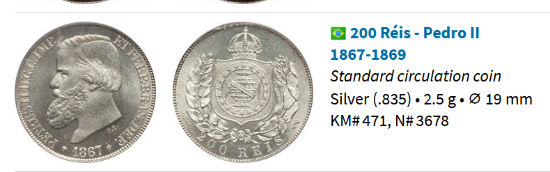 Di norma questa moneta è in bronzo, ma questo esemplare ha tracce importanti di argentatura. Probabilmente per spacciarla come una moneta d'argento da  200 reis, simile per dimensione (19 mm contro 20 mm) e stemma imperiale....