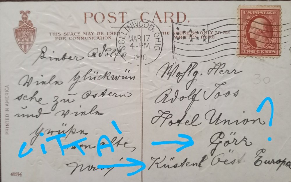 dareios it Inviato 11 Ottobre, 2024 Supporter Autore #7 Inviato 11 Ottobre, 2024 All'inizio pensavo potesse essere in un albergo americano in uno dei suoi tanti soggiorni, ma nella data di spedizione di questa cartolina, il Loos dalla sua biografia non risulta in America. Poi sotto l'indirizzo del destinatario si legge Europa. Quindi sicuramente la spedizione è partita dagli USA verso l'Europa e la missiva è in lingua tedesca, sicuramente auguri di un amico o amica, visto la presenza di un solo nome. Spero di non aver detto qualche castroneria. Mi è partito per sbaglio il messaggio di prima. Ma ho trovato!!! Gorz non è altro che il nome in tedesco di Gorizia che all'epoca era territorio asburgico. Mistero risolto!