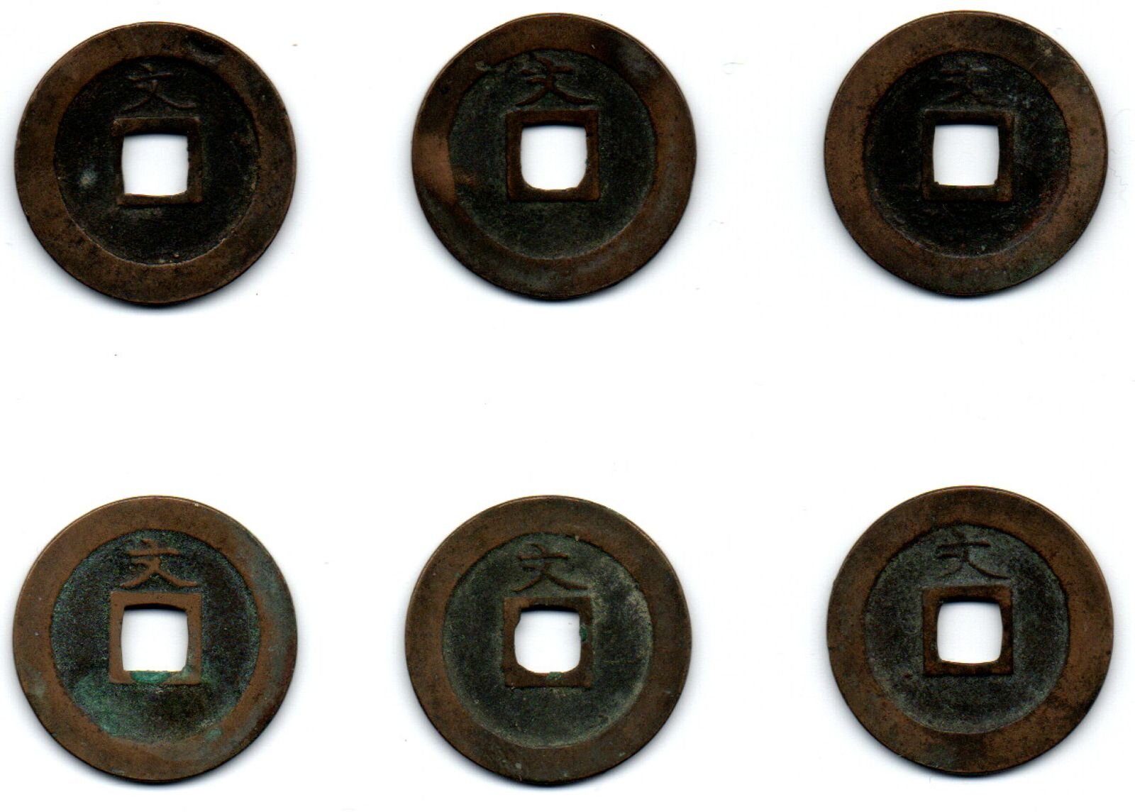 Ecco il set di 6 monete. Ho scoperto, grazie ad alcuni gentili membri di questo forum (in particolare @Kojiki) che si tratta di shin kan hei tsu ho da 1 mon prodotti a Kameido (provincia di Musashi) tra il 1668 e il 1718.