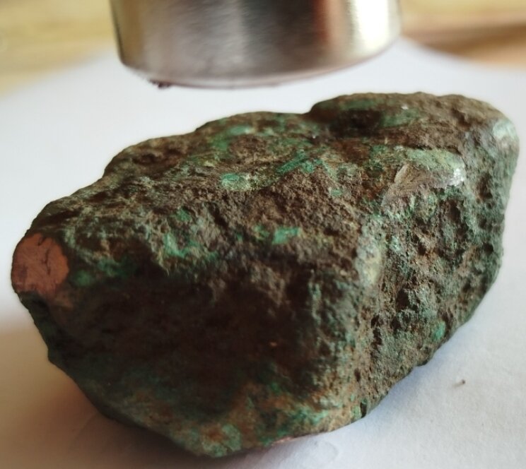 Comunque, scherzi a parte, diverse caratteristiche sopra elencate, la caratteristica magnetica, l'odore, il peso, ecc. conducono appunto come supposto al minerale di calcopirite, minerale formato in parti quasi uguali da ferro, rame e zolfo e usato per l'estrazione del rame e del ferro (e che esiste anche in forma massiva, informe, e non cristallizzata).