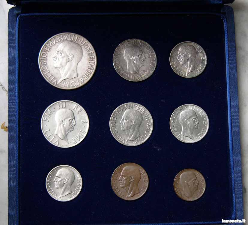Buonasera.La serie zecca del 1936 in astuccio originale blu con il monogramma RZ esiste. Le confezioni con le preziose monete vennero donate alle più alte personalità dello stato per la celebrazione dell'impero.