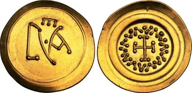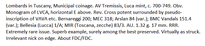 Da Lucca longobarda, un vistoso esemplare di tremisse, valutato RRR, con al diritto monogramma ed al rovescio croce contornata da segni .