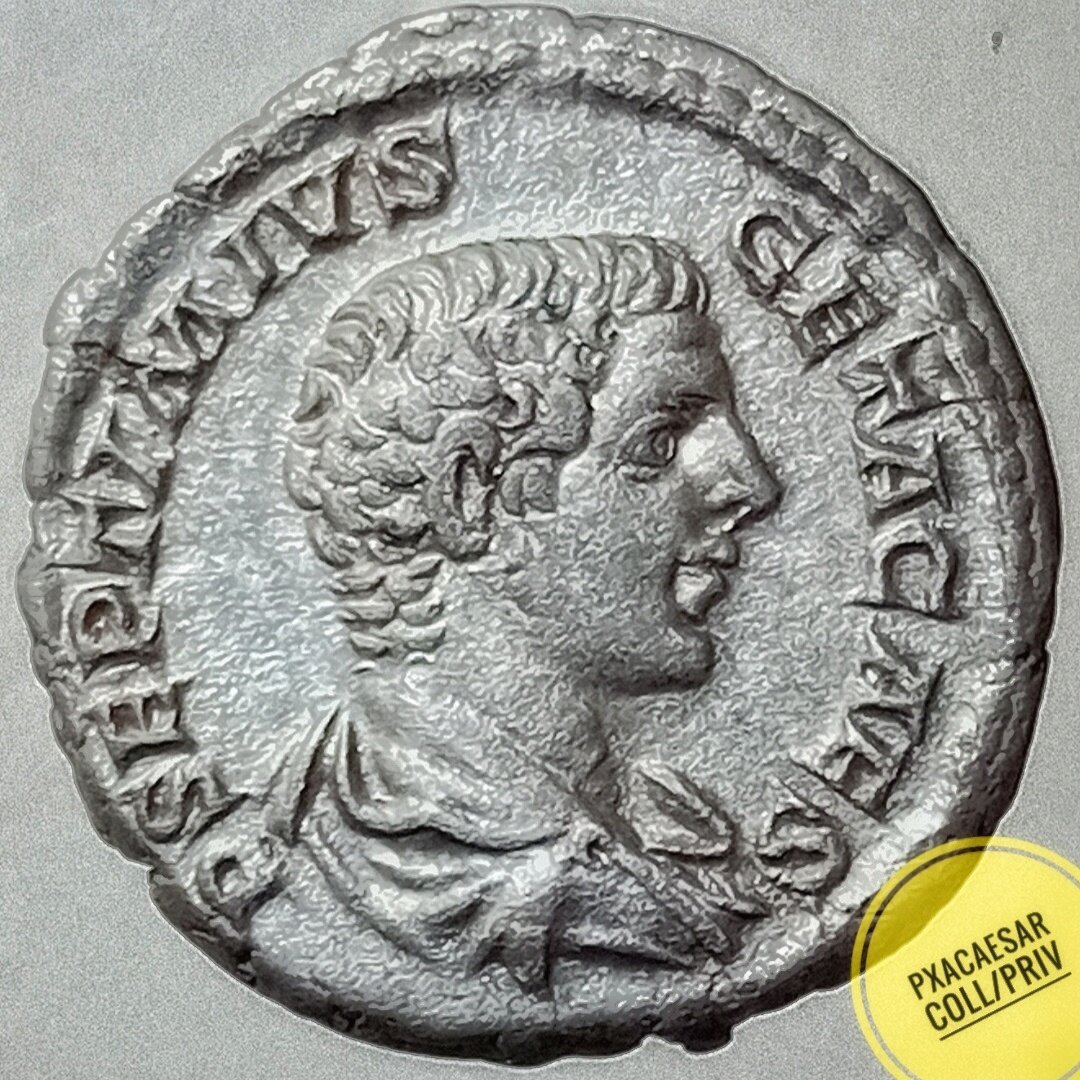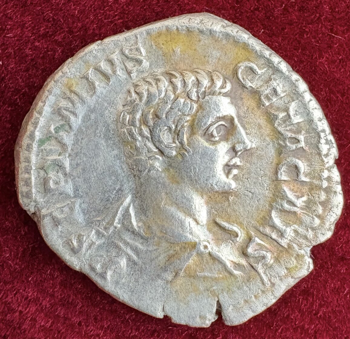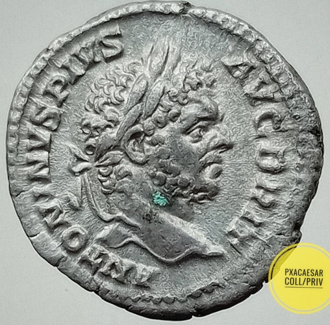Ciao, due bei denari dei fratelli "coltelli" Caracalla e Geta, figli dell'imperatore Settimio Severo e dell'augusta Giulia Domna. Sempre in combutta tra di loro il padre li designo' entrambi a guidare l'impero e fu così fino alla sua morte. L'astio tra i due si acqui subito dopo la morte del padre è Caracalla non esitò ad eliminarlo e sembra, dalle cronache del tempo, che lo fece personalmente. Cosa aggiungere...Quello di Geta ( RIC 61) presenta sul rovescio la raffigurazione della sua figura che regge un globo.  Rappresenta l'Impero nelle sue mani che si impegna a proteggere. Quello di Caracalla (RIC 192) ha sul rovescio la personificazione di Ercole, simbolo di forza e potenza, necessarie per affrontare i popoli ostici della Britannia contro i quali tutti gli imperatori romani hanno trovato vita difficile. Coniato probabilmente per ricordare le campagne militari a riguardo. Per quanto concerne le macchie verdi si tratta molto probabilmente di affioramento di malachite dalla lega di argento ( quest'ultimo ridotto al 50% proprio dalla riforma monetaria di Caracalla che introduce anche un nuovo nominale, appunto l'antoniniano). Ti posto un mio esemplare di denario di Caracalla con stesso affioramento ( P.S. non è suberato) ed un mio esemplare di denario di Geta della stessa tipologia del tuo 🙂.