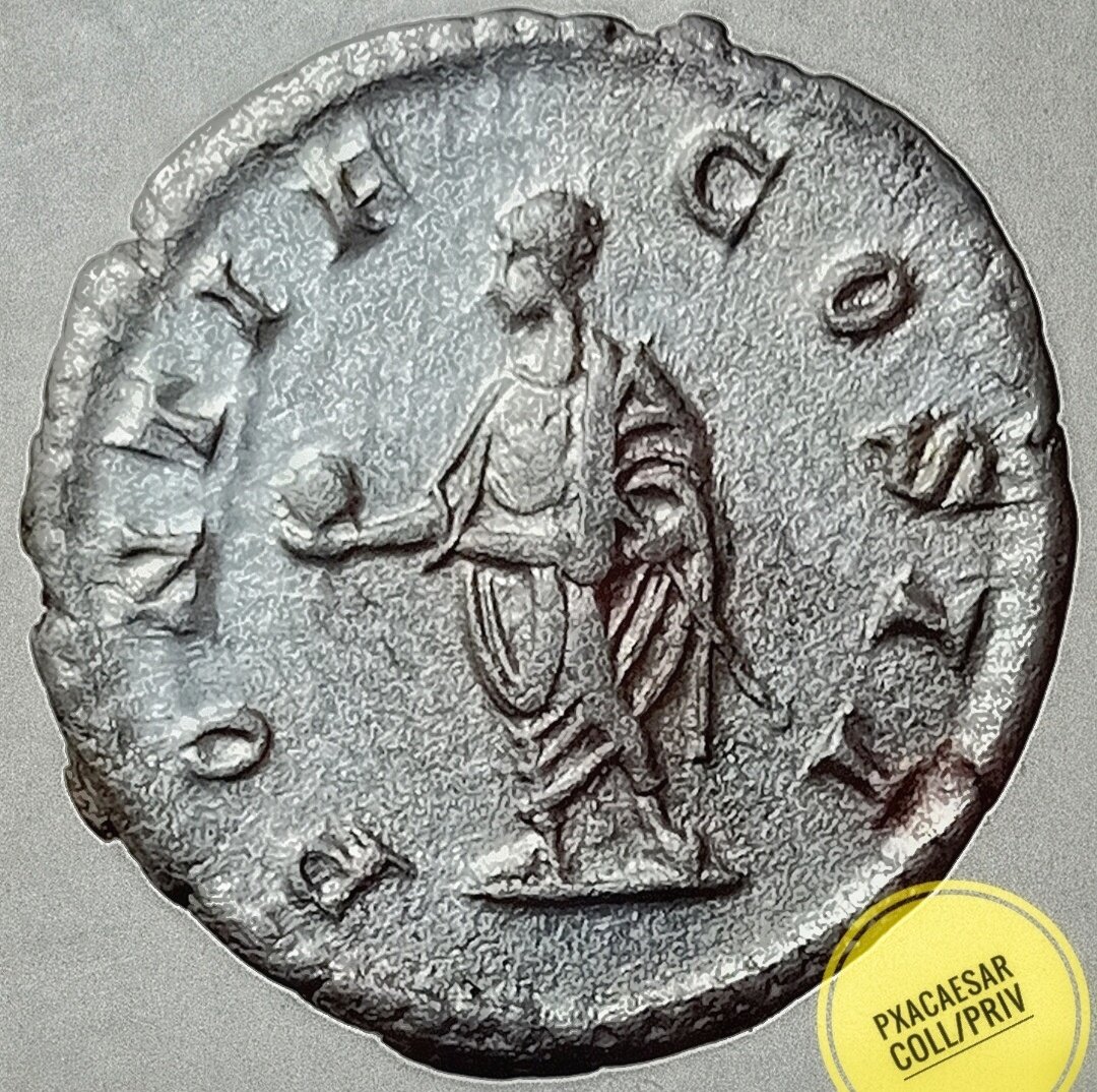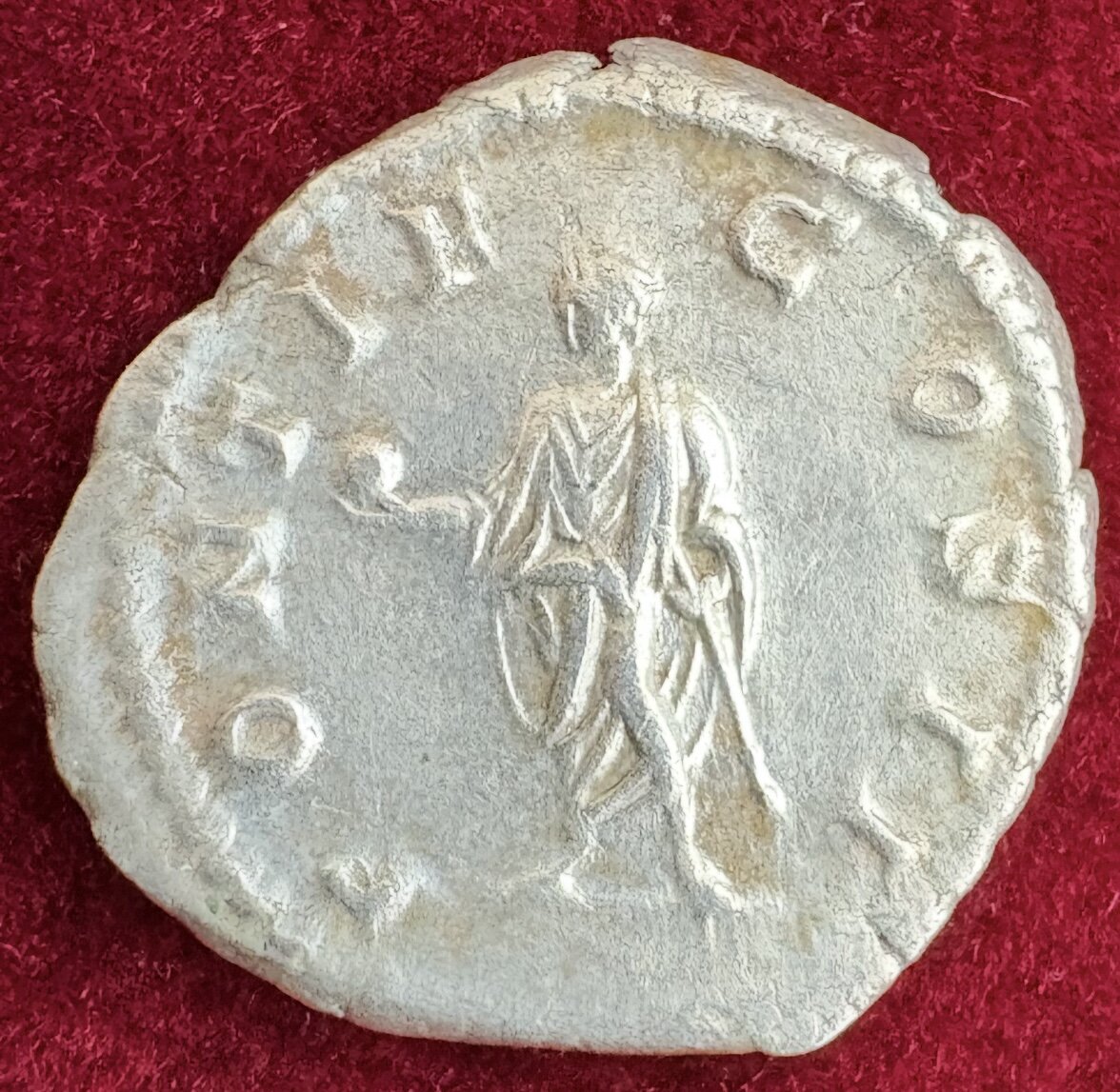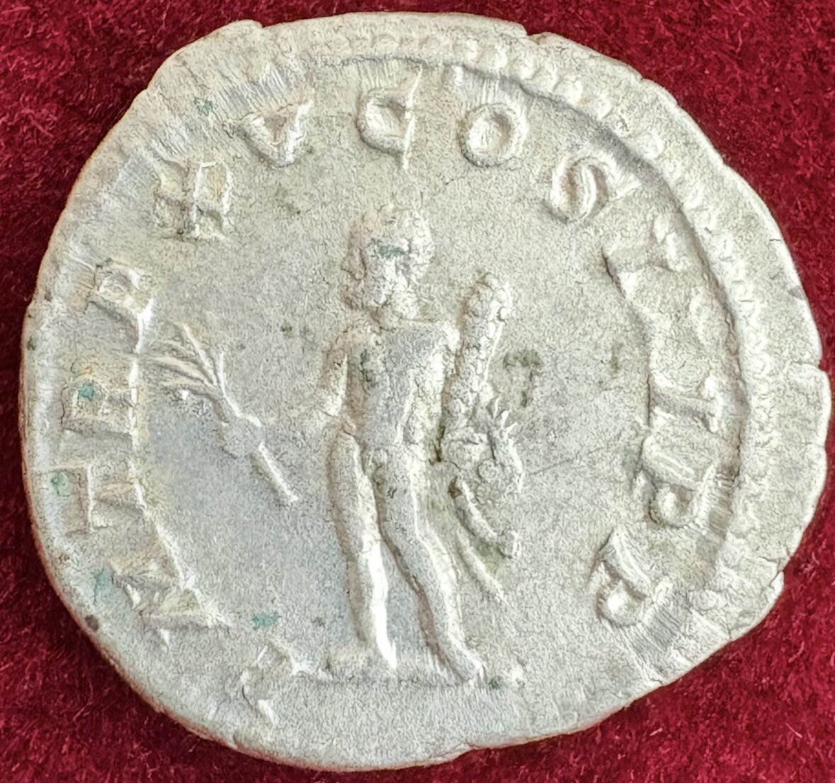 Ciao, due bei denari dei fratelli "coltelli" Caracalla e Geta, figli dell'imperatore Settimio Severo e dell'augusta Giulia Domna. Sempre in combutta tra di loro il padre li designo' entrambi a guidare l'impero e fu così fino alla sua morte. L'astio tra i due si acqui subito dopo la morte del padre è Caracalla non esitò ad eliminarlo e sembra, dalle cronache del tempo, che lo fece personalmente. Cosa aggiungere...Quello di Geta ( RIC 61) presenta sul rovescio la raffigurazione della sua figura che regge un globo.  Rappresenta l'Impero nelle sue mani che si impegna a proteggere. Quello di Caracalla (RIC 192) ha sul rovescio la personificazione di Ercole, simbolo di forza e potenza, necessarie per affrontare i popoli ostici della Britannia contro i quali tutti gli imperatori romani hanno trovato vita difficile. Coniato probabilmente per ricordare le campagne militari a riguardo. Per quanto concerne le macchie verdi si tratta molto probabilmente di affioramento di malachite dalla lega di argento ( quest'ultimo ridotto al 50% proprio dalla riforma monetaria di Caracalla che introduce anche un nuovo nominale, appunto l'antoniniano). Ti posto un mio esemplare di denario di Caracalla con stesso affioramento ( P.S. non è suberato) ed un mio esemplare di denario di Geta della stessa tipologia del tuo 🙂.