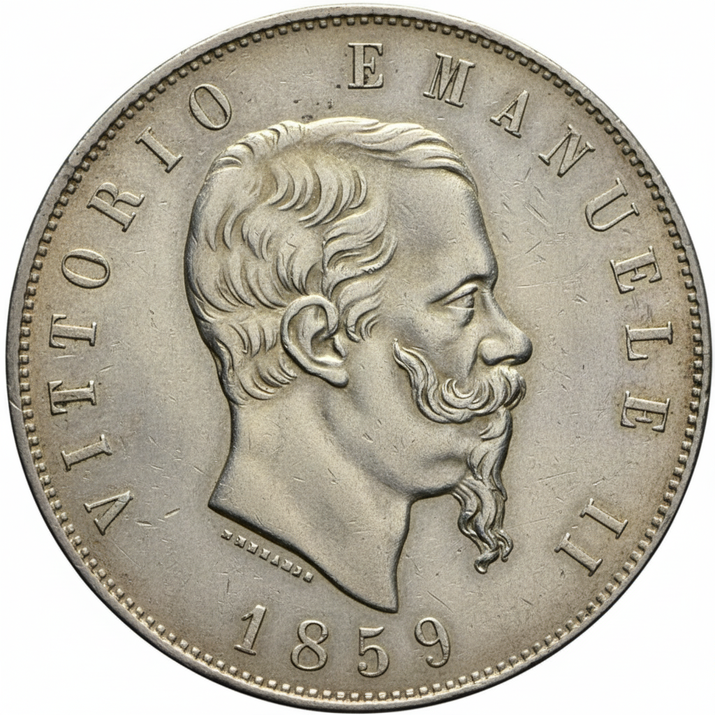Per continuare sulla falsariga, vi presento una moneta che fu donata ad un pro-prozio che lavorava al Monte di pietà a Torino, credo sia un pezzo unico (un unicum) se non addirittura un prototipo, in quanto coniato nel 1859, quando il Regno d'Italia era ancora solo un'idea dei patrioti risorgimentali.