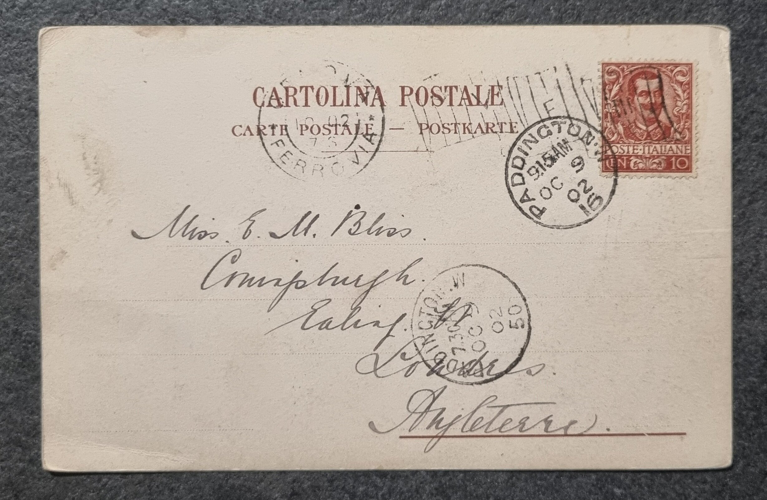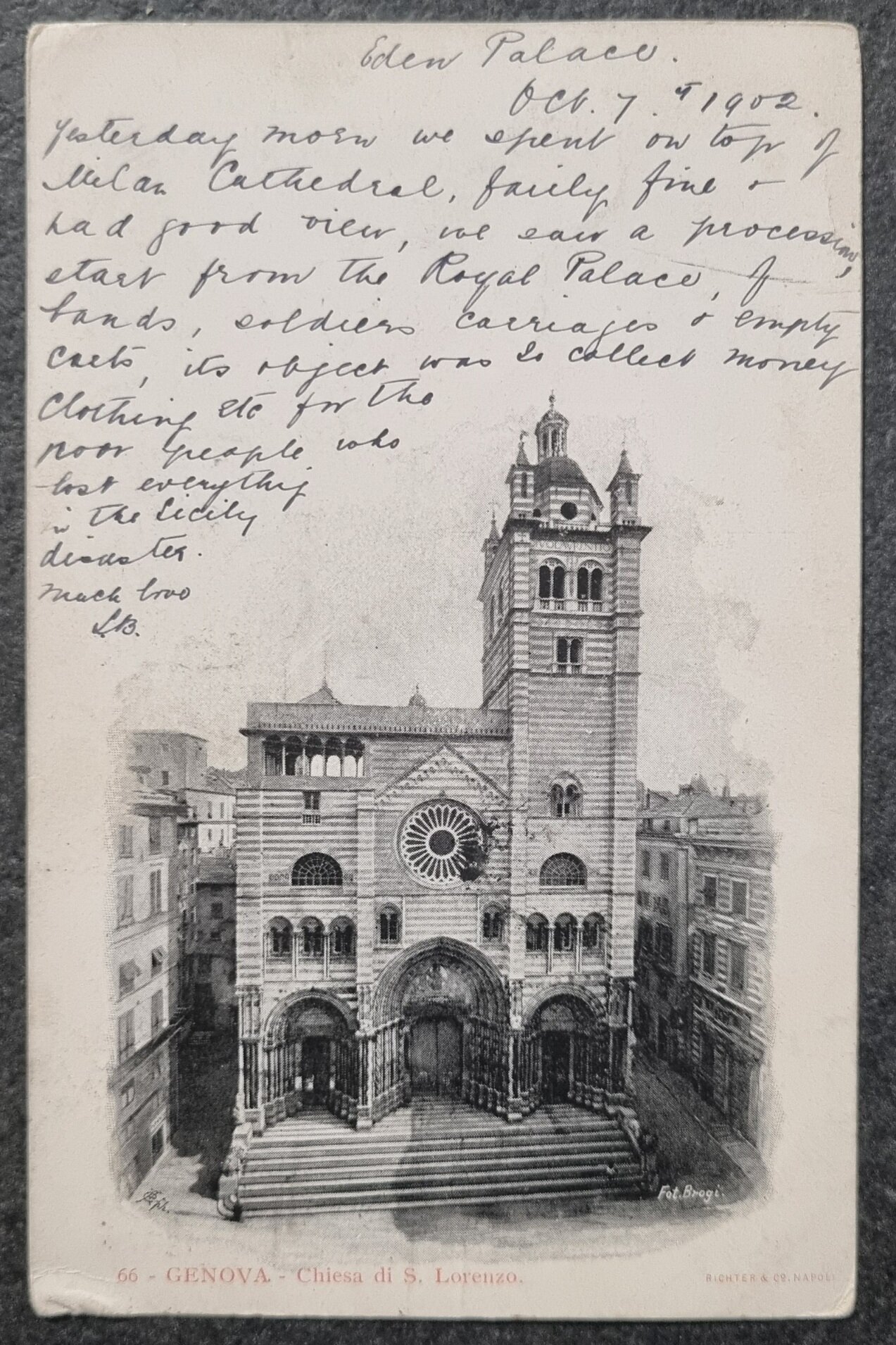 Carlo. Inviato 2 ore fa #1 Inviato 2 ore fa Buongiorno a tutti, Mostro una seconda (e per ora ultima) cartolina, viaggiata nel 1902 tra Genova e l'Inghilterra (non comprendo bene la destinazione). L'illustrazione è una fotografia della Cattedrale di Genova, consacrata a San Lorenzo il 10 ottobre del 1118 da papa Gelasio II. Divenne sede vescovile (poi arcivescovile) al posto della Basilica di San Siro, intitolata al primo Vescovo di Genova. la facciata della Cattedrale oggi la cartolina di inizio '900. Come si può notare, il prospetto della facciata è stato modificato nel secondo dopoguerra, dopo che anche la Cattedrale fu bombardata (se non erro dagli Inglesi nel '41), tanto che ancora oggi, appena all'ingresso della navata destra, è presente una bomba non esplosa della seconda guerra mondiale, che sfondò parte del tetto. Aggiungo un articolo per eventuale approfondimento https://www.ilcittadino.ge.it/80-anni-fa-il-miracolo-della-bomba-inesplosa-in-cattedrale/ Per quanto riguarda gli aspetti di storia postale, la cartolina è affrancata con un 10 centesimi floreale, con timbro di partenza da Genova Ferrovia il 7.10.1902, timbro di arrivo Paddington (non l'orsetto, bensì la stazione londinese) il 9.10.1902. Mi pare abbia viaggiato molto veloce.. forse leggo male la data di partenza? In corrispondenza del destinatario è presente anche un secondo timbro di Paddington, stesso giorno ma delle ore 7.30. Chissà?? Vengo al dunque: mi piacerebbe sapere qualcosa di più circa gli aspetti postali (tariffa, francobollo affrancata, altro..); inoltre, se qualcuno con una buona conoscenza za dell'inglese mi aiutasse a comprenderne appieno il testo ne sarei grato. Ringraziandovi per l'attenzione, buon fine settimana Carlo