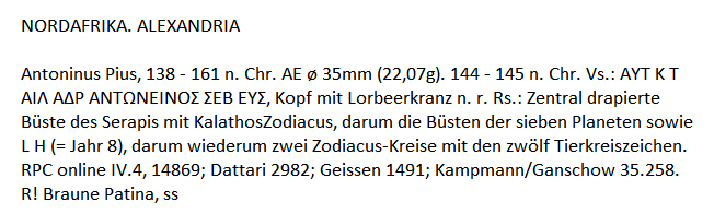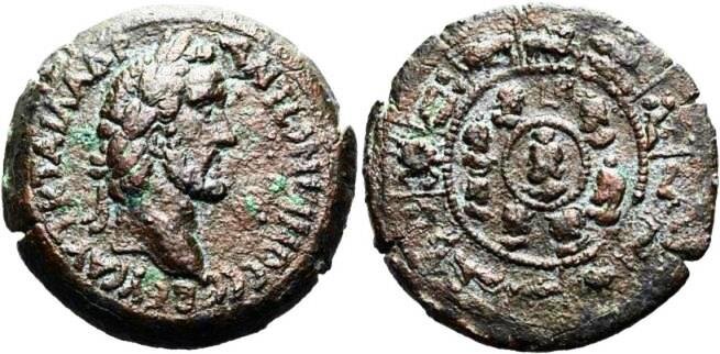 Da Alessandria in Egitto, un esemplare in AE valutato R , con al diritto testa laureata dell' imperatore ed al rovescio piccolo busto di Serapis entro cornici con simboli .