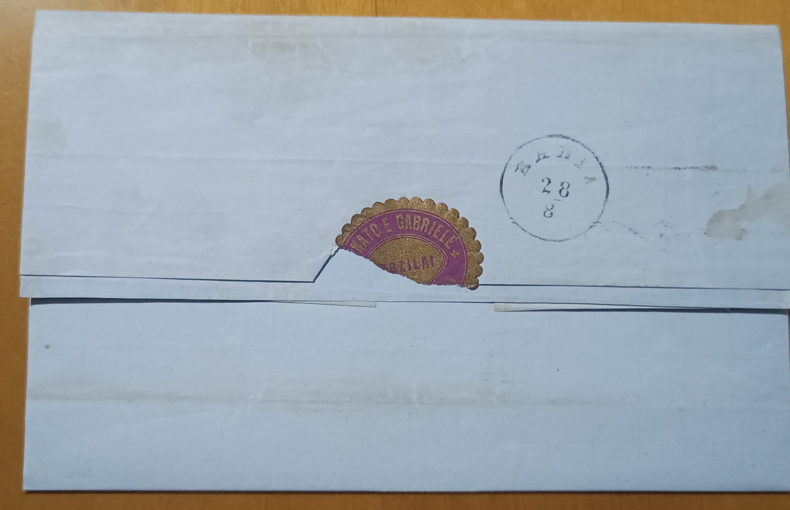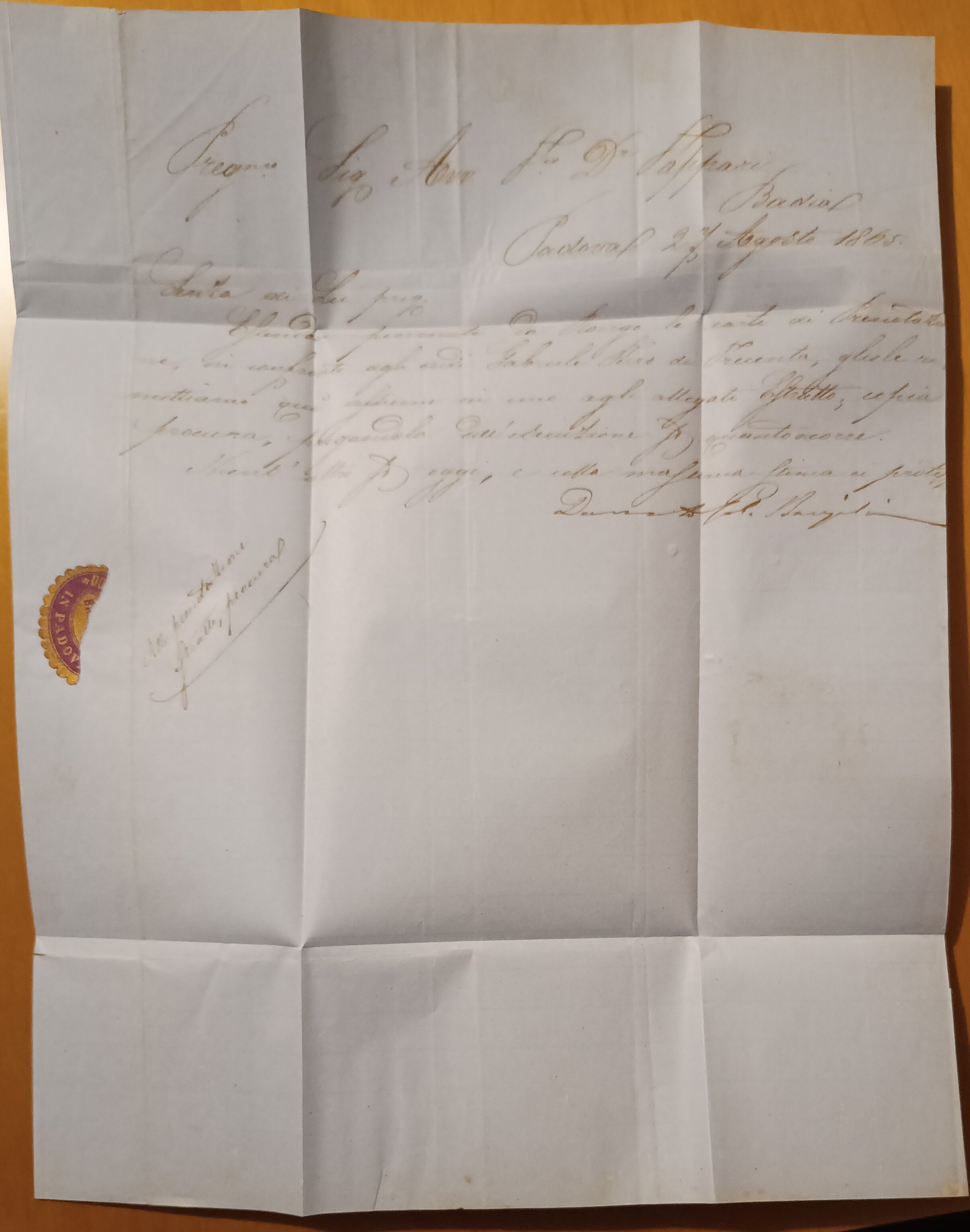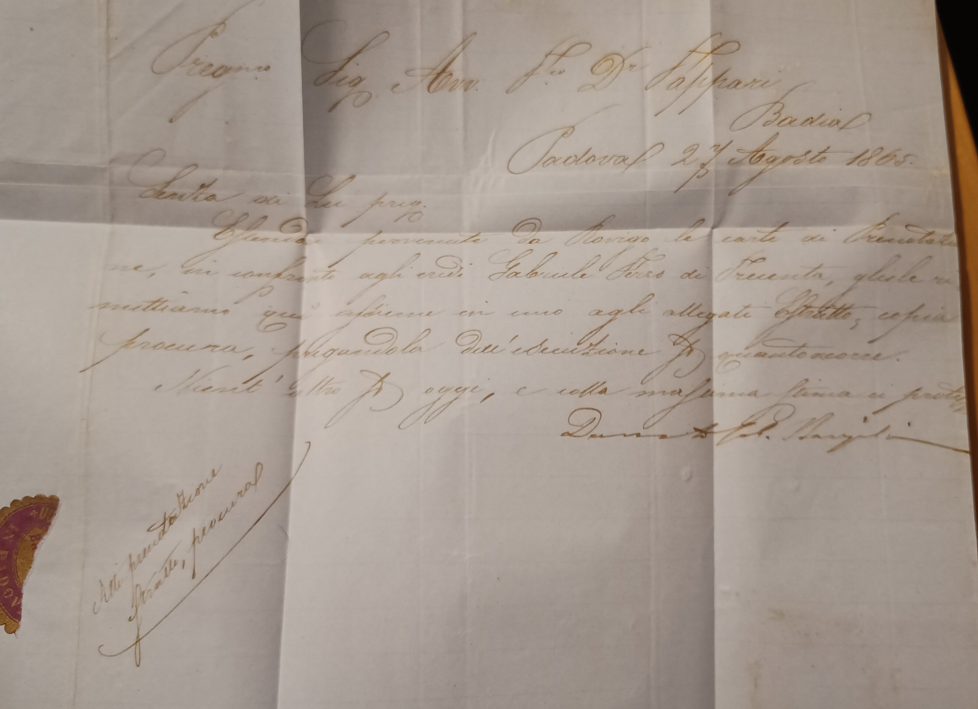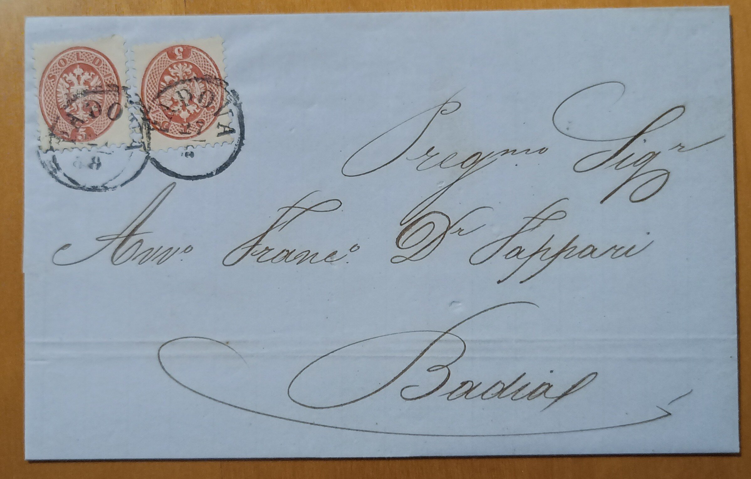 Lettera da Padova a Badia del 27 agosto 1865 affrancata per 10 soldi con 2 esemplari da 5 soldi (sassone 43).