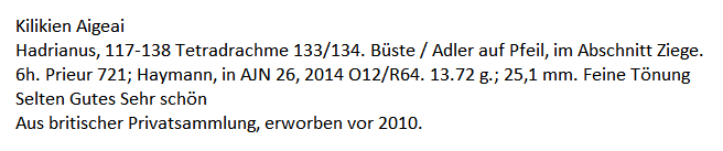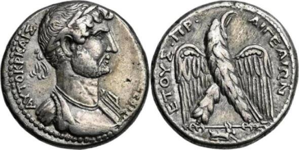 Da Aigea di Cilicia, un vistoso esemplare di tetradrammo al nome di Adriano, con al diritto busto dell' imperatore ed al rovescio aquila .