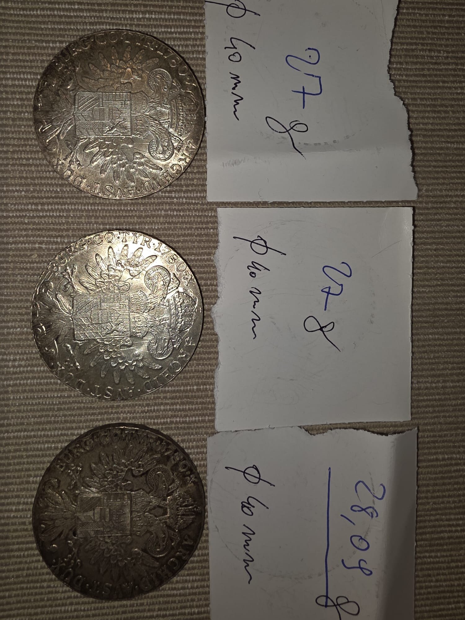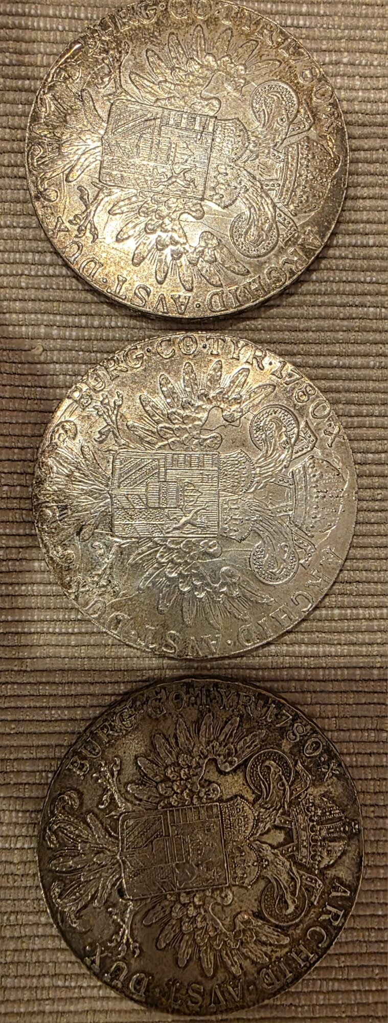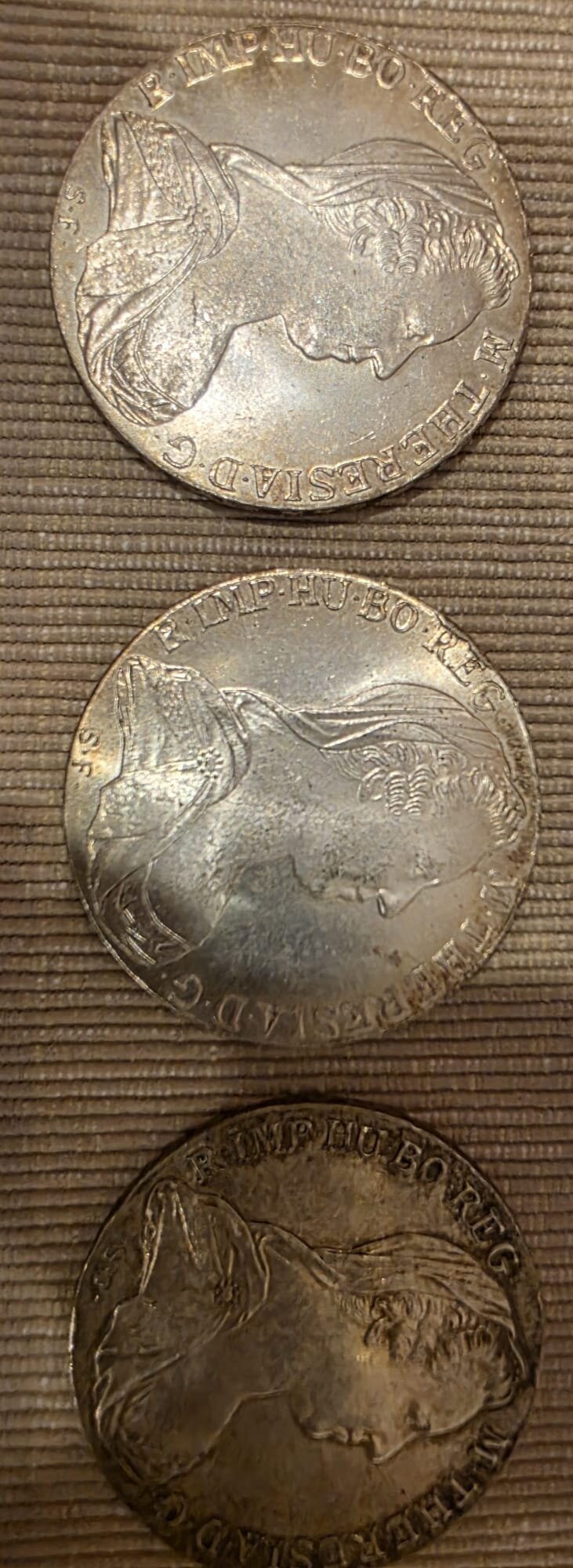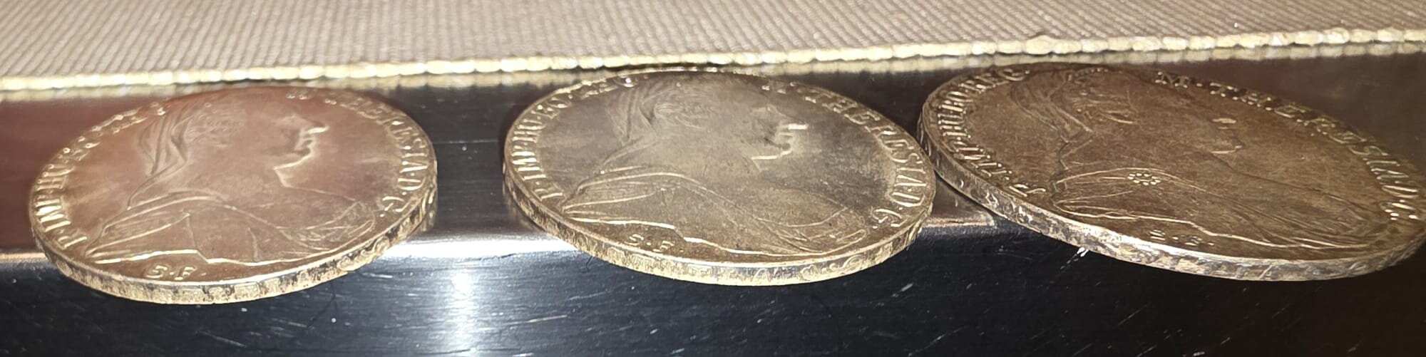 faccio questo post per aiutare un amico che ha ritrovato in casa questi 3 talleri di Maria Teresa, di solito si posta una sola moneta ma ho visto che generalmente su queste siete molto ferrati e dovrebbe andare bene anche così, anche perché ho le foto di gruppo, nel caso poi ci sia interesse ad approfondirne qualcuna vi farò avere le foto singole.