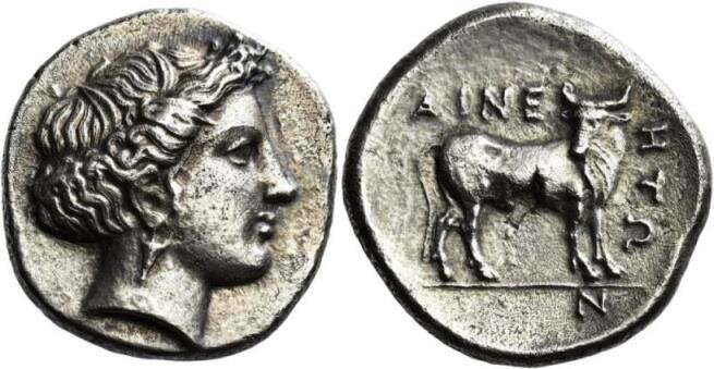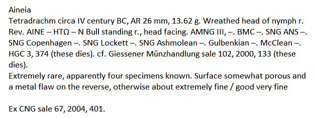 E' valutato " Extremely rare " un notevole esemplare di tetradrammo da Aineia nella Calcidica,  con al diritto testa di ninfa ed al rovescio toro con testa volta di fronte e leggenda .