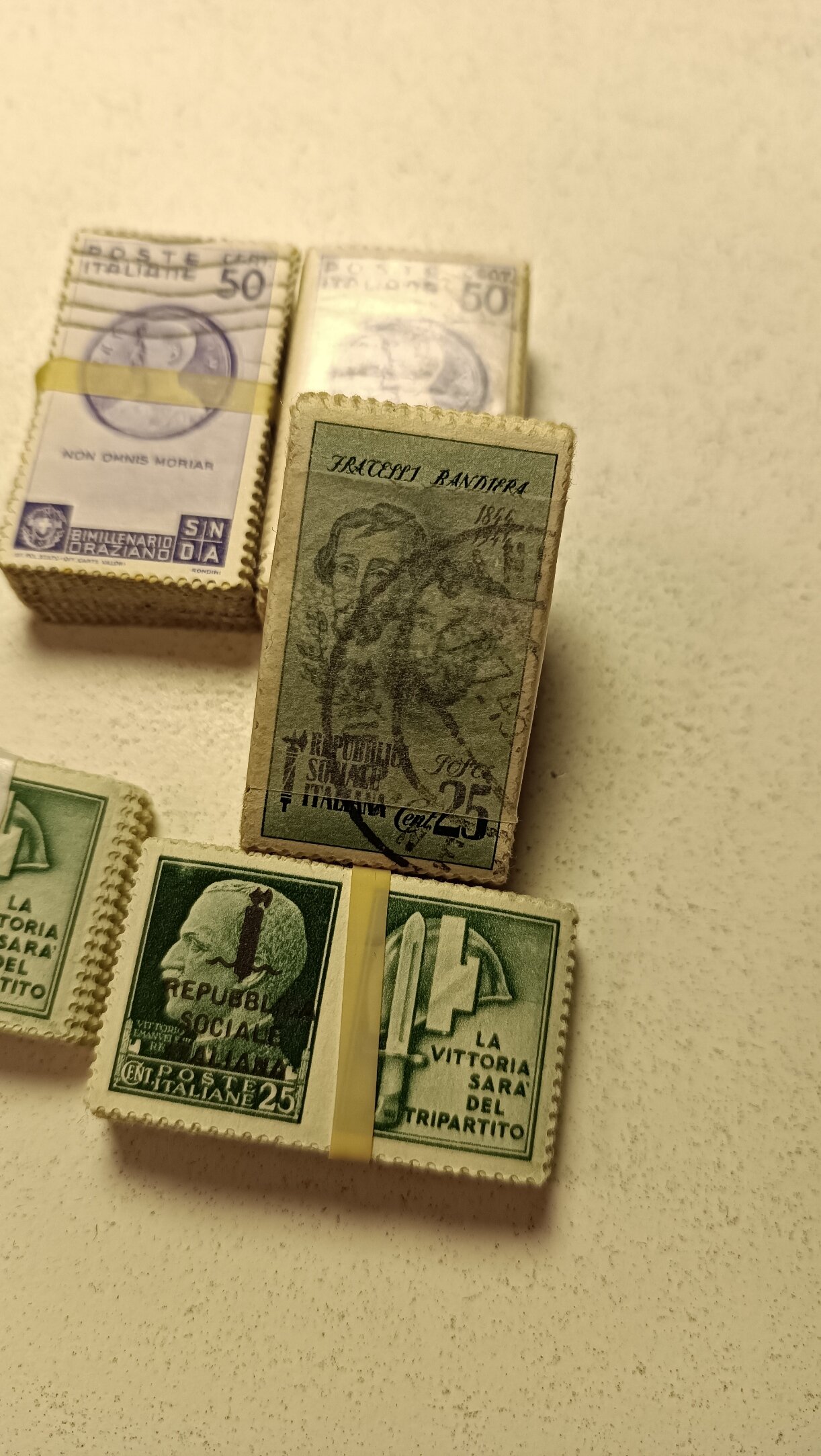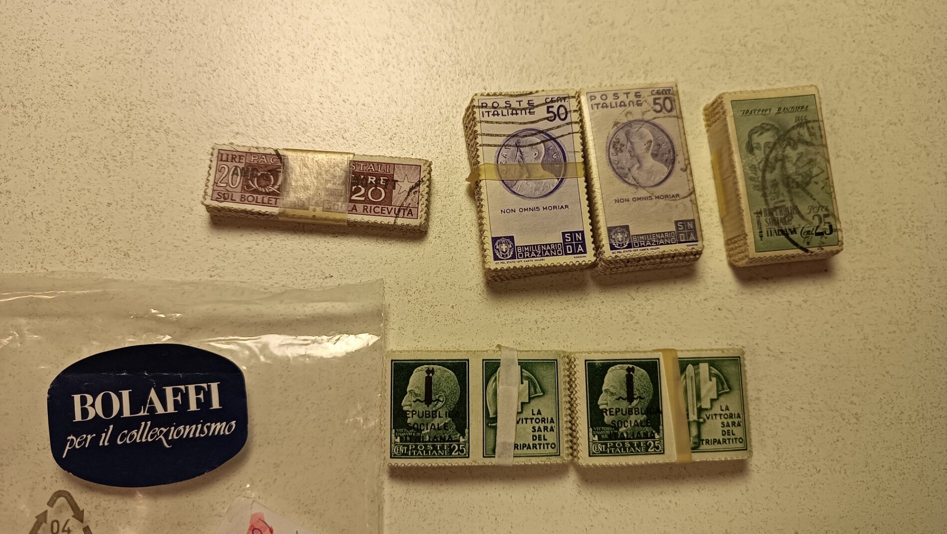 fatantony Inviato 2 ore fa Supporter #1 Inviato 2 ore fa (modificato) Buongiorno e buona Domenica a tutti! Questa settimana ho fatto un giro in un mercatino dell'usato, e la mia attenzione è stata catturata da una bustina con adesivo Bolaffi contenente il materiale che mostro di seguito. - 50 centesimi "Bimillenario Oraziano" viaggiati, non li ho contati con precisione ma saranno circa 40; - 20 Lire, bollo per pacchi postali con sovrastampa AMG FTT, viaggiati, saranno circa 20; - 25 centesimi "Fratelli Bandiera" viaggiati, circa 30 pezzi. Sul primo mi sembra di vedere un annullo datato 17.7.45; - 25 centesimi "Propaganda di guerra" nuovi con gomma integra, con sovrastampa RSI. Due lotticini per un totale di circa 40 pezzi. Ora sono qui a chiedere gentilmente un vostro parere sull'acquisto, e anche su eventuali rarità, considerando che ho pagato 20€ il tutto. Se servono altre foto, o dettagli, sono a disposizione. Grazie in anticipo! Modificato 2 ore fa da fatantony