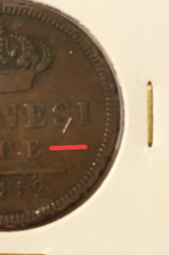 Salve ho questa 2 tornesi di Ferdinando II in un oblò ma si vede una strisciolina bianca . Per voi si tratta di sporcizia o di qualcos'altro? Grazie in anticipo e buona serata!