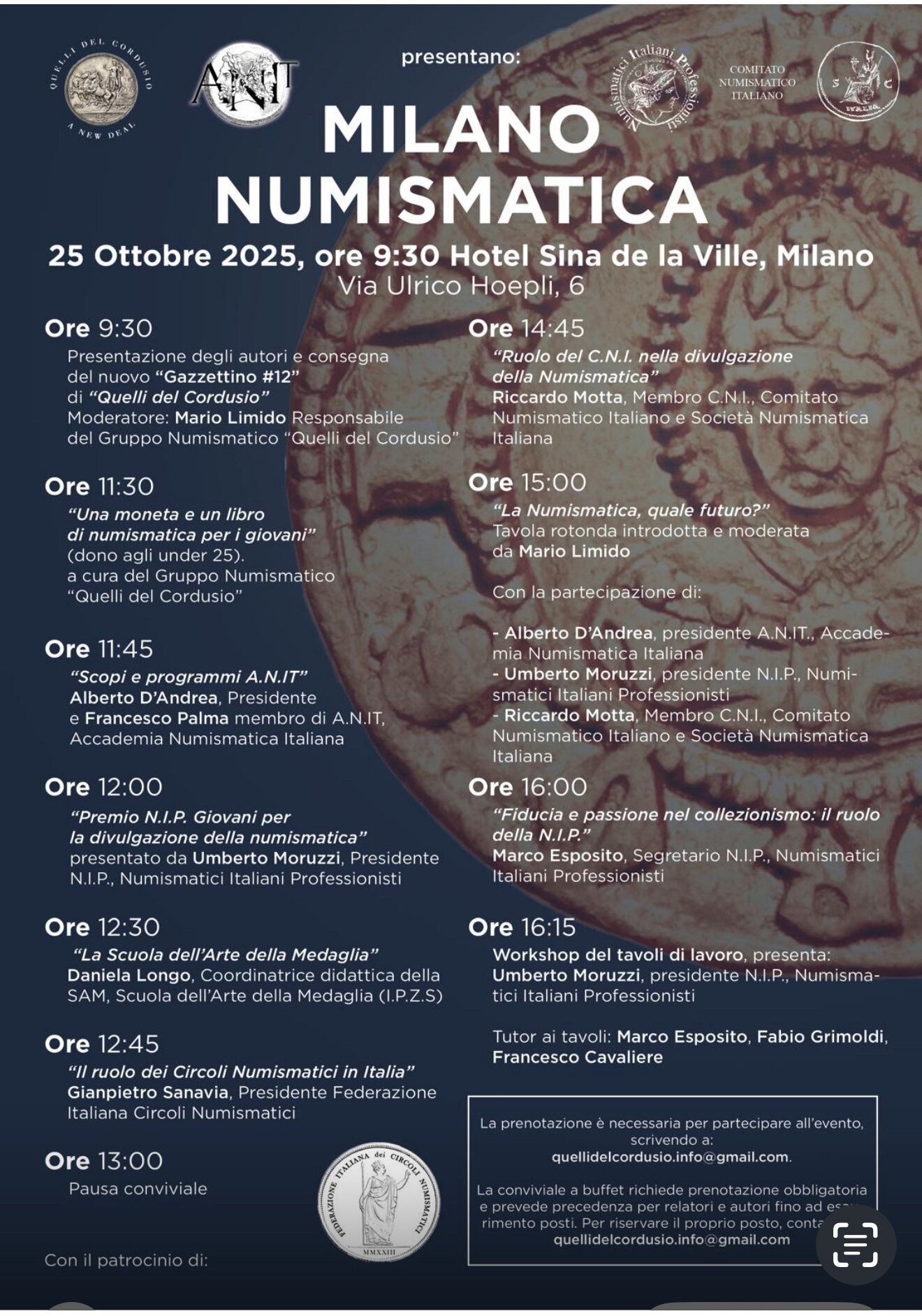 dabbene Inviato 2 ore fa #1 Inviato 2 ore fa Ecco la locandina col programma di Milano Numismatica, 25 ottobre 2025, Ancora 4/5 posti disponibili [email protected]