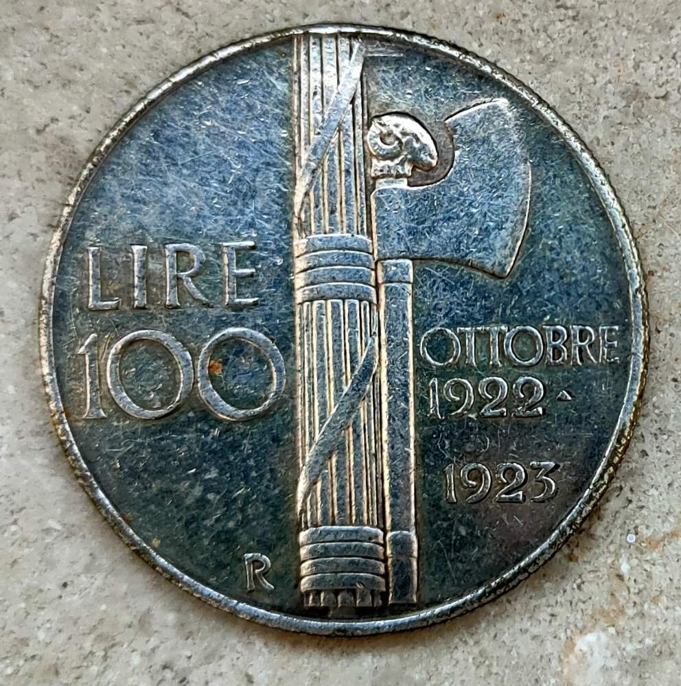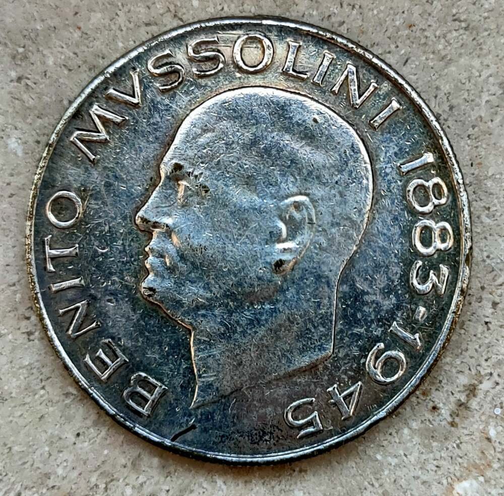 Ora, so benissimo che non è una moneta "vera", che Mussolini non poteva essere raffigurato essendo il capo di Stato Vittorio Emanuele III, e se guardate bene sul rovescio è indicata la data "ottobre 1922" e "1923", ma poi sul dritto ci sono le date di nascita e morte del Duce, quindi è chiaramente una roba postuma di, suppongo, qualche nostalgico.