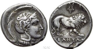 ARES III Inviato 42 minuti fa #9 Inviato 42 minuti fa LUCANIA. Velia. Nomos - Didrachm (Circa 300-280 BC). Obv: Head of Athena right, wearing crested Attic helmet decorated with griffin; Δ to upper right. Rev: YEΛHTΩN. Lion advancing right; above, pentagram between Φ - I. Williams 438; HN Italy 1306; SNG ANS 1366-71; HGC 1, 1319. Condition: Very fine. Weight: 7.22 g g. Diameter: 20 mm. Cita