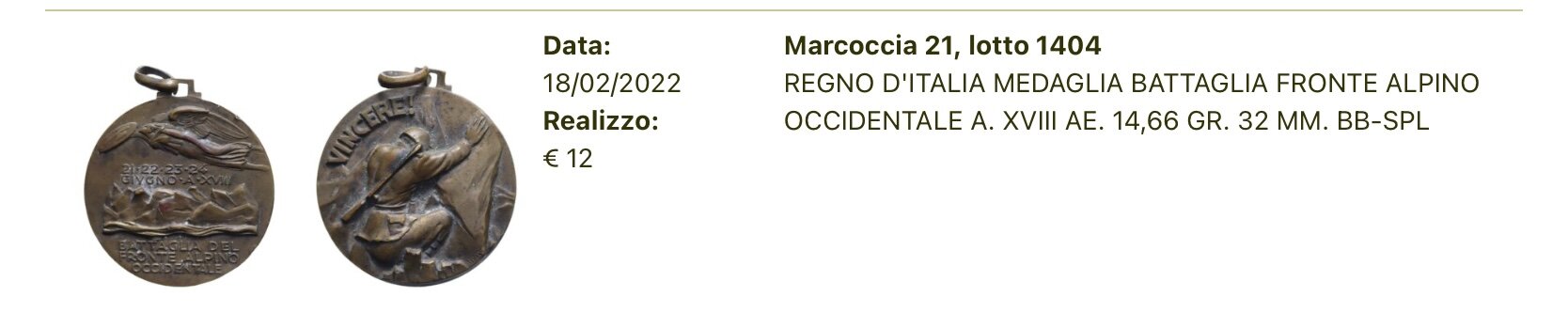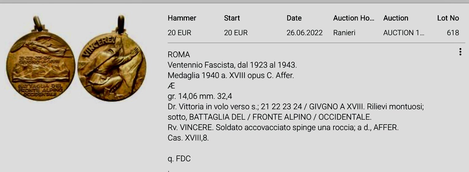 Buonasera a tutti, ho visto che è presente sui cataloghi, anche se le aggiudicazioni sono abbastanza basse per questa medaglia.