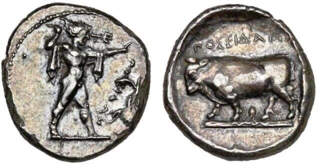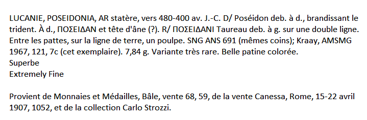 Di antica presenza sul mercato, un particolare esemplare di statere a doppio rilievo da Poseidonia, valutato " Variante très rare ", con al diritto Poseidone con tridente ed al rovescio toro .